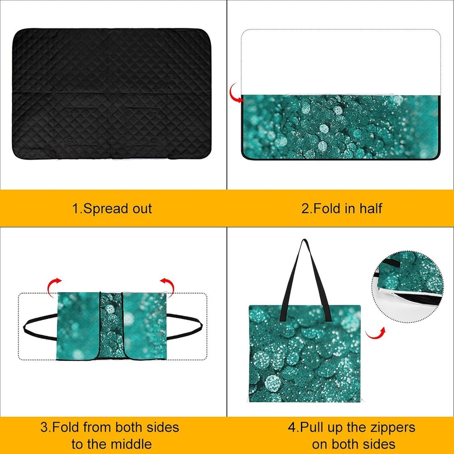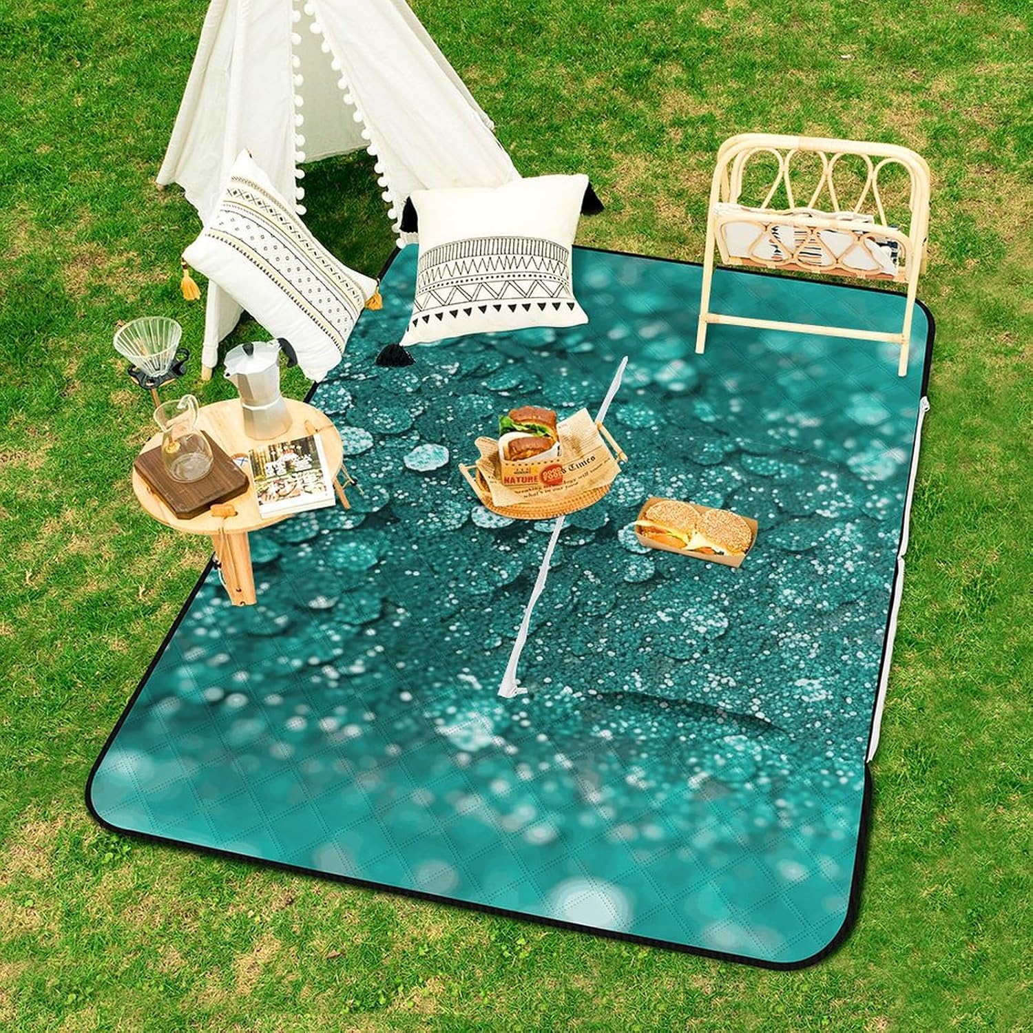 This versatile Turquoise Glitter printed mat effortlessly transforms into a shopping bag for women when folded, making it the ideal accessory for any outing. Unfold it to reveal a spacious and comfortable picnic area, providing ample room for family and friends to relax and enjoy the great outdoorsCrafted from a premium triple-layer material consisting, this picnic mat offers unparalleled waterproofing, heat insulation, and durability. Whether you're lounging on a wet grassy field or a sandy beach, our mat keeps you dry and comfortable, ensuring a pleasant outdoor experience every timeThe waterproof surface is not only easy to clean but also dries quickly, making maintenance a breeze. Simply shake off sand, wipe away dirt, maintaining its color and shape even after multiple washesOur extra-large picnic mat is perfect for a variety of outdoor activities, including picnics, beach trips, camping, RV adventures, patio lounging, and more. With its portable and foldable design, it's easy to carry and store, making it a must-have for all your outdoor escapades