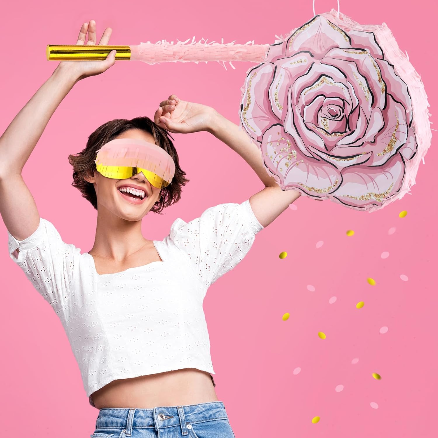 Features: The four piece piñata set is easy to use: it includes a piñata, a pink and gold tapping stick, an eye mask, and pink and gold confetti. A complete set with a unified color scheme, it's ready to set up right out of the box, creating a gentle and romantic party atmosphere. Easy to fill and use: the flower piñata can be filled with candy, small gifts, and colored confetti without damage, creating a surprise atmosphere. Specifications: Material: paper Color: pink, gold Size: Piñata: 16.54 x 15.75 x 3.15 inches/42 x 40 x 8 cm Stick: 15.75 inches/ 40 cm Eye mask: 6.69 inches/ 17 cm Package includes: 1 x Piñata 1 x Stick 1 x Eye mask 1 x Confetti Notes: Manual measurement, please allow slight errors on size. The color may exist a slight difference due to different screen displays.