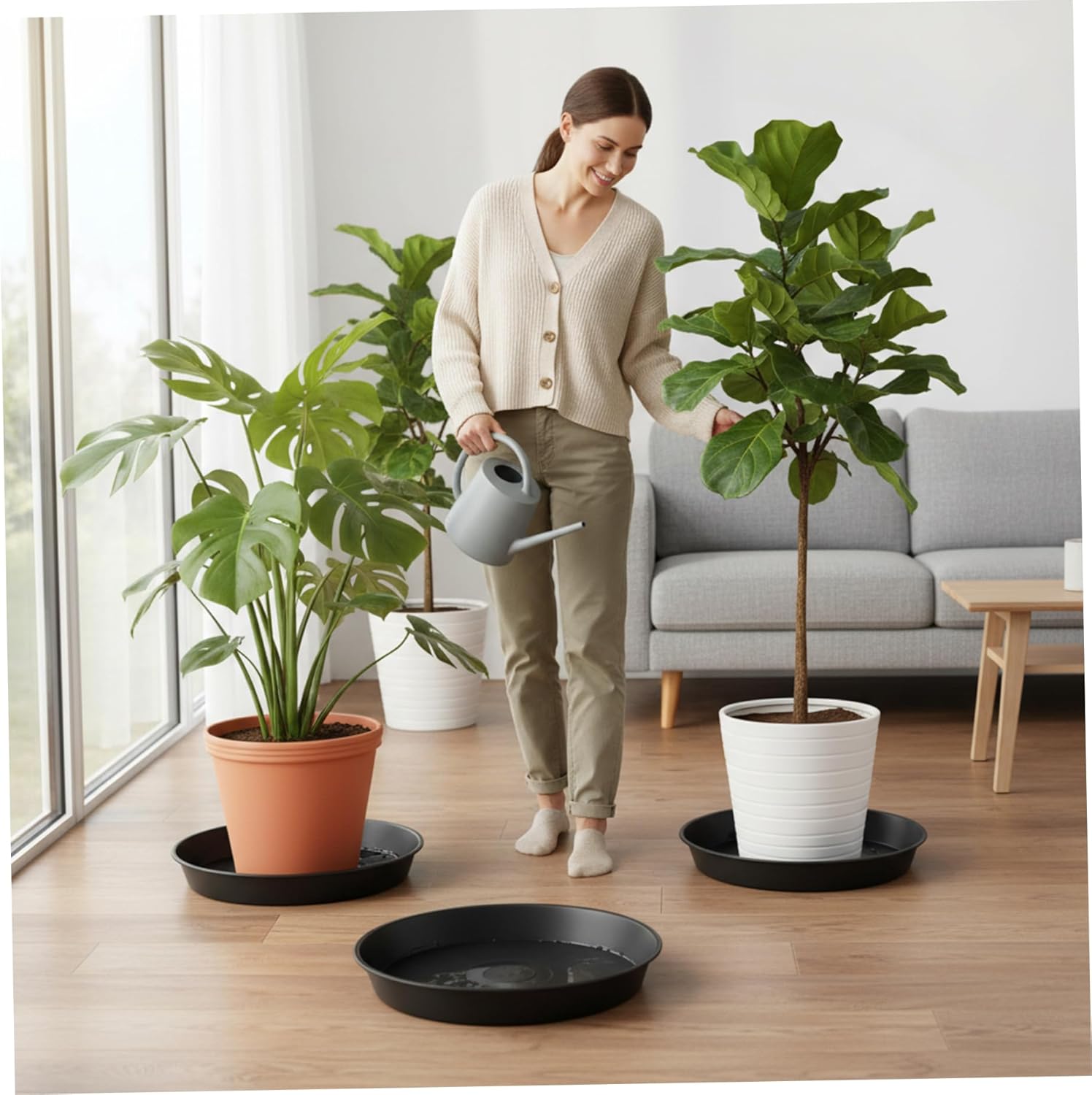• Stylish & Practical Design: Featuring a sleek round shape with a neutral color to seamlessly match any pot style or decor, enhancing the aesthetic appeal while delivering practical function