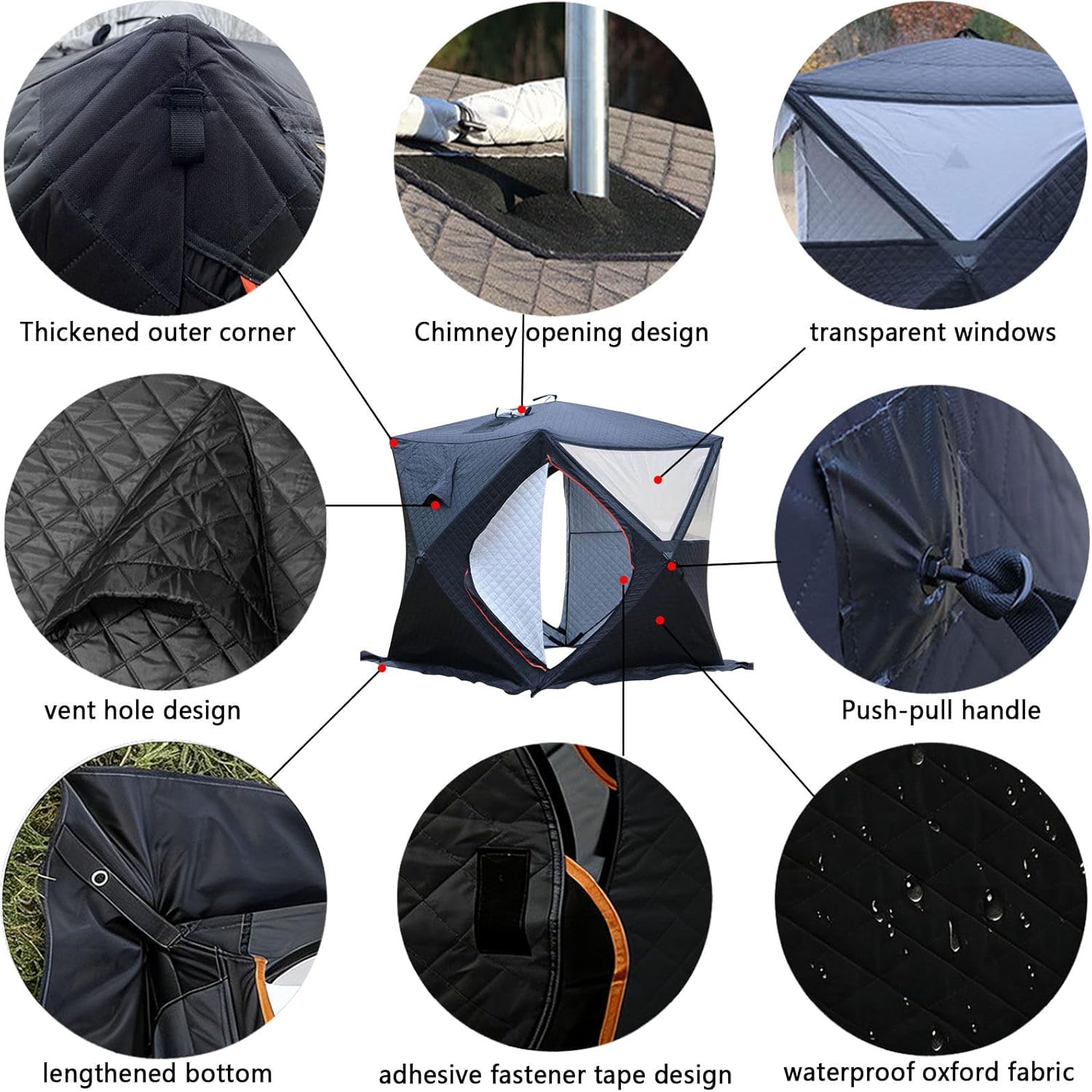 • 【SUITABLE FOR ALL SEASONS】This multi-purpose tent serves not only as a winter ice fishing shelter but also as an outdoor sauna and leisure tent usable year-round. Its unique 3D diamond structure effectively reduces rain and snow accumulation, lowering roof pressure. High-light-blocking fabric and a flexible ventilation system ensure optimal performance in all seasons. Integrates durability, comfort, and practicality—ideal for frequent anglers and Outdoor sauna enthusiasts.