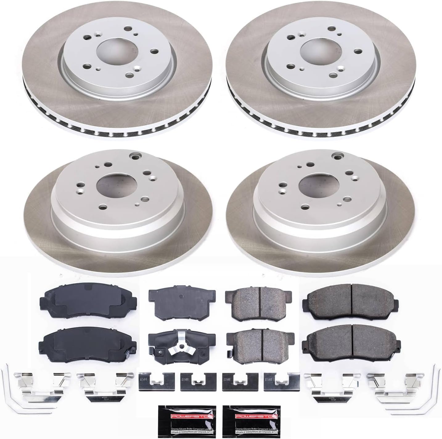 Product: PowerStop Z17 Brake Pad kit with Semi-Coated Rotors, Shims, and Installation HardwareWhat’s in the Box: This Z17 brake kit includes Z17 Ceramic Brake Pads, Semi-Coated Rotors, Rubberized Shims, and Stainless-Steel Installation HardwareEngineered For:Daily Driving - Quiet and dependable, this kit is an affordable stock replacement to your standard OE brakesQuality Without Compromise - Our Z17 Pads, and Semi-Coated Rotor Kit provides a cost effective bundle and crack resistant rotors for improved durabilityClean Wheels – Clean-Ride ceramic formula helps reduce brake dust for longer-lasting wheel cleanlinessComponent Breakdown:The Pads (Z17 Formula) - The included Z17 pads use a low-dust, chamfered & slotted, ceramic pad. This provides stopping power without creating noiseThe Rotors - Semi-Coated rotors are mill balanced and G3000 casted to maintain OE performance and safety with additional durabilityThe Hardware - High-quality stainless steel installation hardware makes an easy install even easierInstallation: A true bolt-on performance upgrade. No modifications required. Includes all necessary stainless-steel hardware for a hassle-free installThis Item Fits:Front and Rear: 2012-16 Honda CR-V AWD