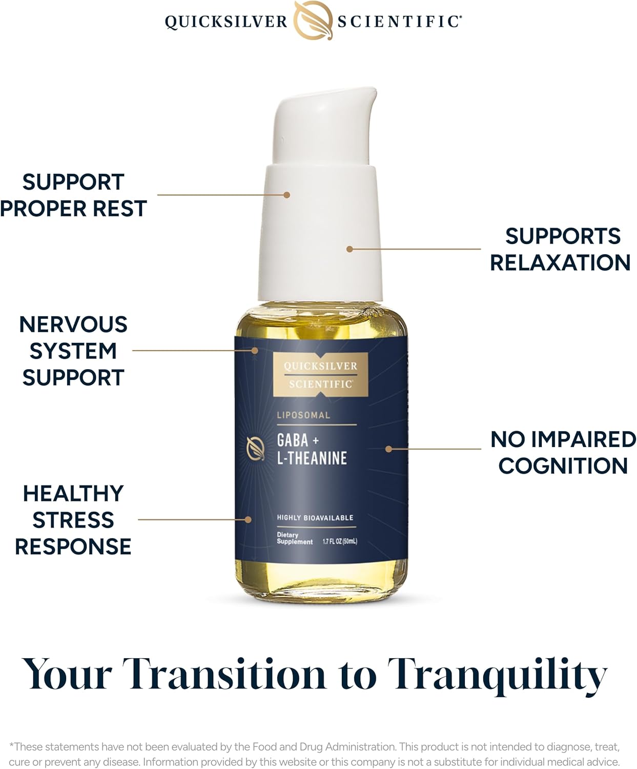 This bundle includes: Quicksilver Scientific Liposomal Melatonin - Bedtime, Jet Lag & Immune Support Liquid for Adults - Efficient, Superior Absorption 1mg Melatonin to Minimize Morning Drowsiness (30 ml) and Quicksilver Scientific Liposomal GABA + L Theanine - Calm, Stress Response & Brain Support - Bioavailable GABA Supplement with L Theanine 100mg (1.7oz/50ml)