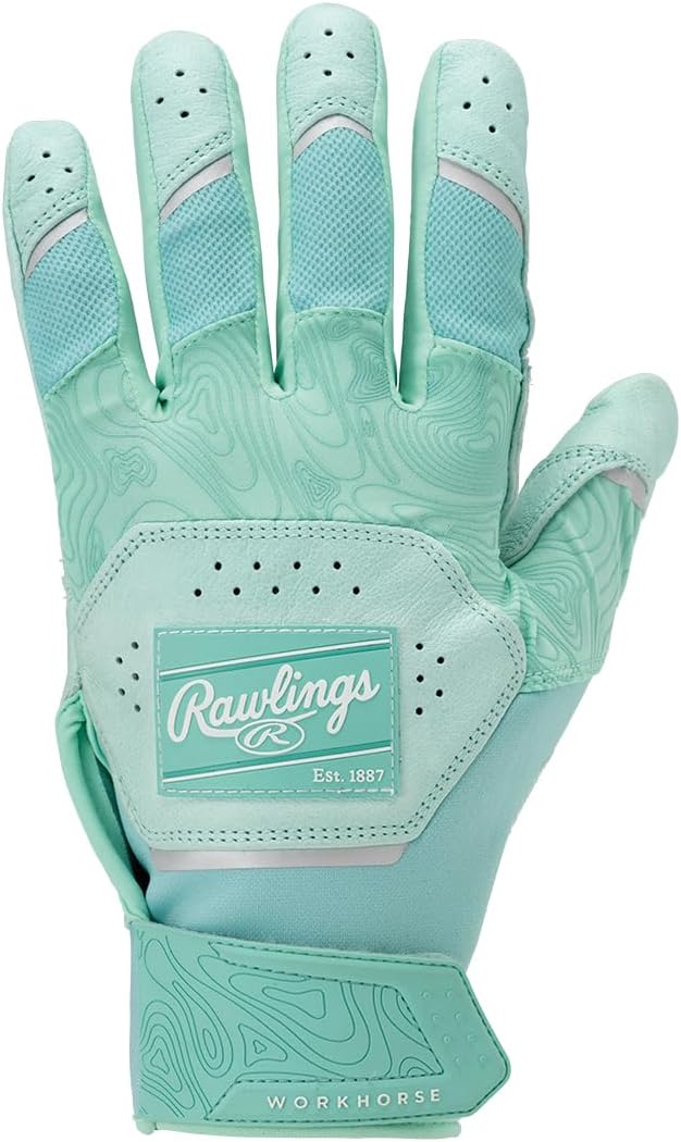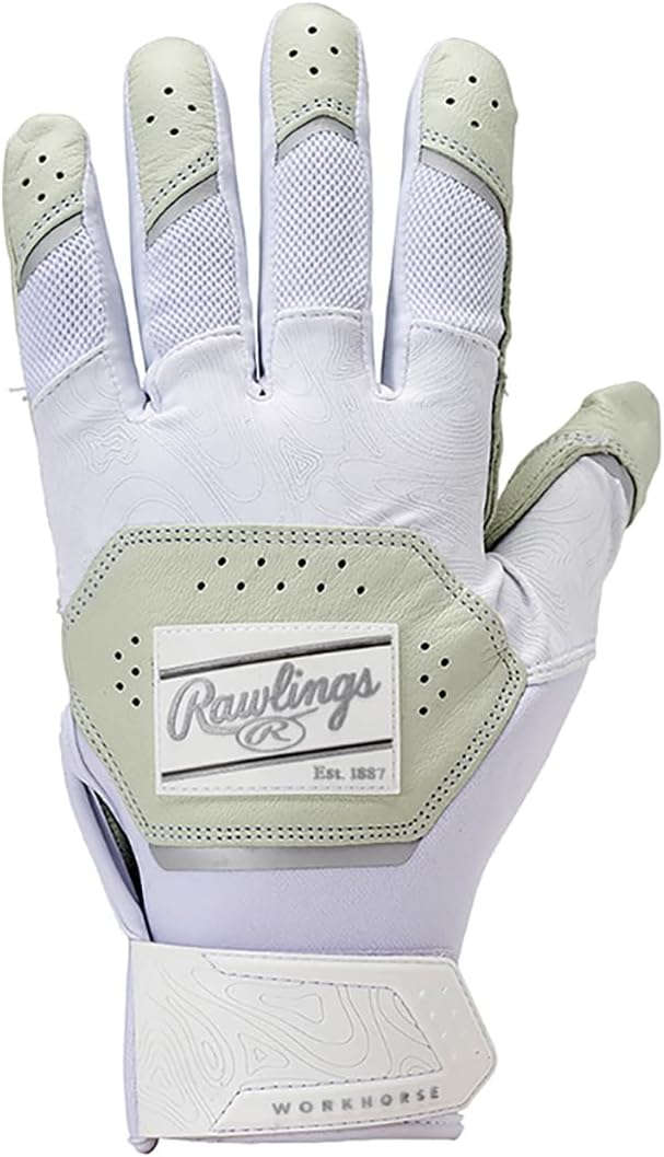 Premium batting gloves that combine high durability and comfort: Thick goatskin leather palm for durability and comfort /Double stitched rolled edges for enhanced shape retention. / Neoprene material from wrist to thumb provides a comfortable fit. / Padded butt end for better grip Batting gloves with a silicone patch with a patch logo. Series Features: Heavy duty batting glove series made of thick goatskin leather. Designed to maximize baseball performance for durability and comfort. Great for games and practice. Product Information: Item Number: WH25BG Product Name: 2025 WORKHORSE Batting Gloves Color: Black, Camo, Columbia Blue, Mint, Navy, Red, Royal, USA, White, Yellow Material:Palm:Goatskin Leather/Back:Goatskin Leather,Nylon,Spandex,Neoprene/Wrist:Nylon, Neoprene, Spandex Made in Indonesia Size: USA S, USA M, USA L, USA XL Suitable for: Adult Brand Introduction: The official Japanese shop of Rawlings, the No.1 baseball brand with history and tradition of making baseball products for over 130 years in the US. Since 2020, Grub became an official MLB supplier after the ball and helmet. Rememberable plays are the battle accomplished with Rawlings.