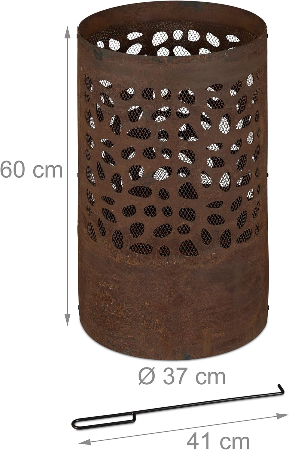 | Item Type Name | Relaxdays Rustic Fire Barrel with Grate, Poker, Spark Protection, H x Ø: 60 x 37 cm, Stone Pattern, Corten Steel, Brown |