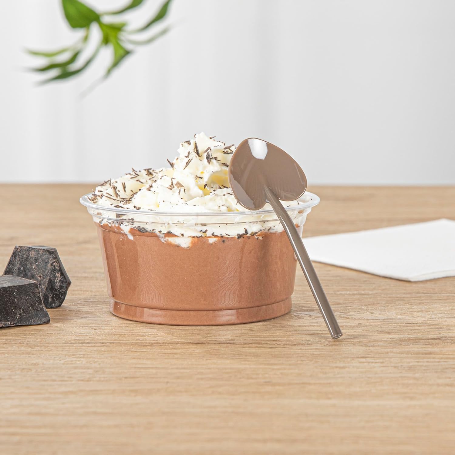 Make your customers' frozen yogurt experience special with our Coppetta Gray Plastic Love Shovel Spoons. Featuring an enticing shovel-shaped design, these mini dessert spoons are perfect for scooping up big bites of ice cream sundaes and heaping spoonfuls of swirled frozen yogurt. These heart-shaped spoons have strong and sturdy plastic construction that makes it easy to dig into big bowls of hand-churned ice cream and effortlessly scoop them up. The long handle of these ice cream spoons is designed to be easy to grip and comfortable for customers to hold. Plus, the ultra-stylish gray finish of these dessert spoons makes them perfect additions to trendy ice cream parlors and fro-yo hot spots. These heart-shaped shovel spoons measure 3.5 inches in length by 1.25 inches in width. Sold in a 500 count box.