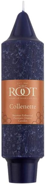 Root - The Best Candles in America, Made in America. Collenette candles have a distinctive, formal profile that lends itself to traditional, formal presentation. A wider diameter virtually assures a flawless performance by eliminating drips. Box of 8 candles, each are 5-inches tall and have a wide 1.25" diameter with a 7/8" tapered base to fit into any fine dinner candle holder. The Timberline finish resembles the smooth weathered bark of a tree, capturing the bold spirit of the great outdoors. Timberline Collenette candles burn an impressive 2-1/2 hours per inch and are available in a designer palette of 13 year round colors and 8 seasonal colors that rotate throughout the year. Available in a wide variety of lengths - 5", 7", and 9". Root Candles is an iconic American company that traces its lineage back to 1869 when founder Amos Ives Root first opened his doors for business in Medina, Ohio. Since then, 5 generations of Root candlemakers have created the best candles in America. Using natural materials for purity and balance, Root candles seduce your senses, enhance your living space and soothe your soul. Candles are manufactured according to all ASTM (safety) standards. Root manufactures their own natural cotton wicks and test burns 1,000 candles every day to check fragrance throw, emissions, soot, flame strength, stability, useful life, welling, dripping, and burn time. Stringent color matching is done daily to ensure consistent quality from batch to batch.