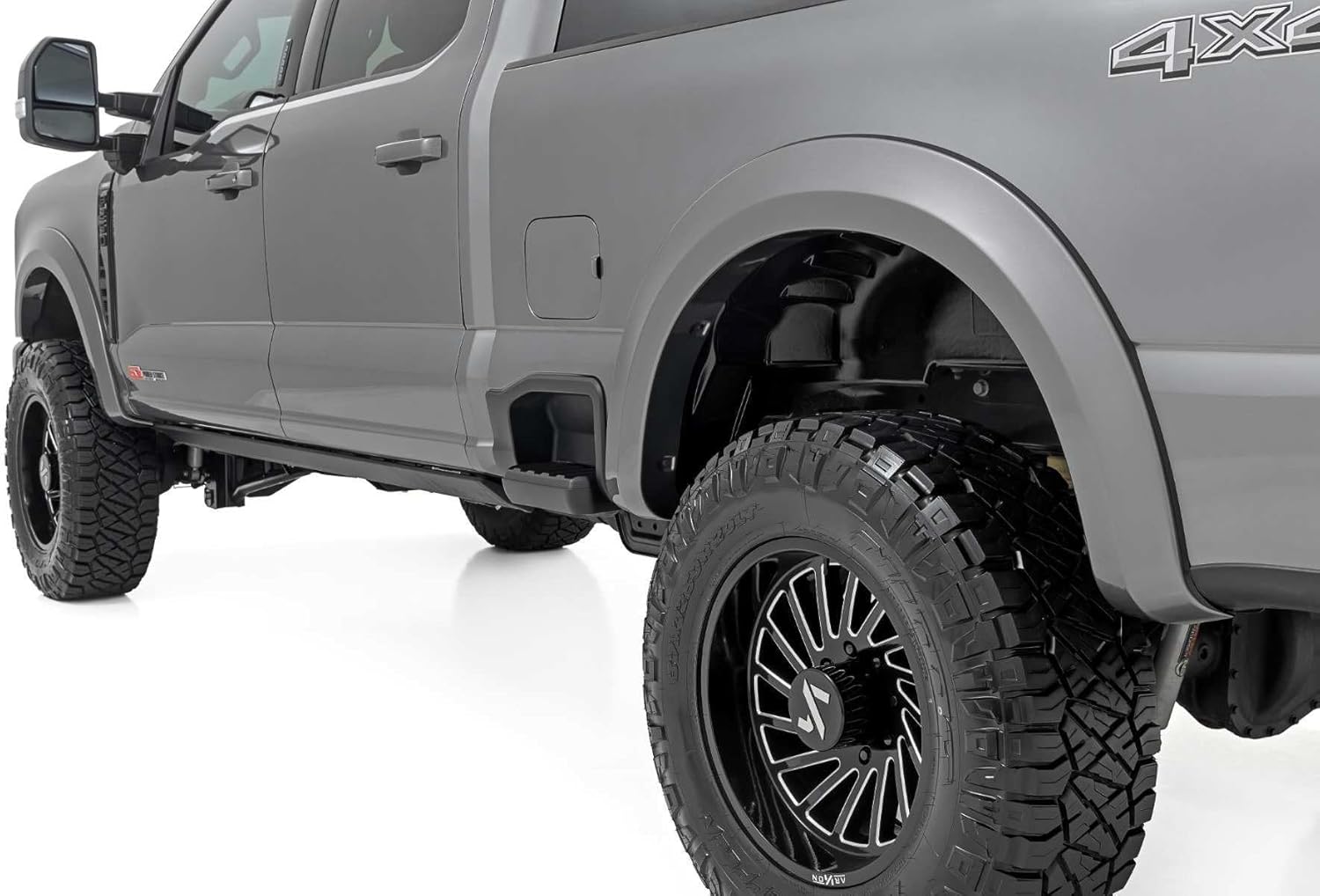 Style and Maximum Coverage: Elevate your Ford F-250/F-350 Super Duty with Rough Country's Sport Style Fender Flares. These flares extend 1 inch for wider tires and offer a 5.75-inch height, giving your truck bold styling, extra clearance, and superior protection from rocks, mud, and road debris. Turn heads with a rugged, custom look that complements your truck's style while keeping it safe.Durable Construction & UV Protection: Crafted from impact-resistant Tri-Blend ABS material, these fender flares are built to withstand the toughest conditions. The built-in UV-resistant finish prevents fading, chalking, and cracking, keeping your vehicle looking fresh no matter the weather. Choose a paint-ready surface for DIY color matching, or select the Paint-to-Code option for a seamless factory color match right out of the box.Easy No-Drill Installation & Removable Design: Designed for a perfect fit using factory mounting points, these fender flares install quickly without drilling. Want to restore your vehicle's stock appearance? Simply remove the flares anytime with minimal effort.Warranty Coverage & Peace of Mind: Every set of Rough Country fender flares is backed by a 3-year limited warranty against manufacturer defects. Paint-to-Code options include a 1-year limited warranty covering paint adhesion and UV protection, so you can enjoy your custom look with confidence.