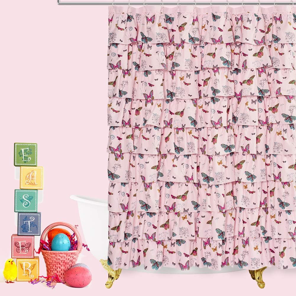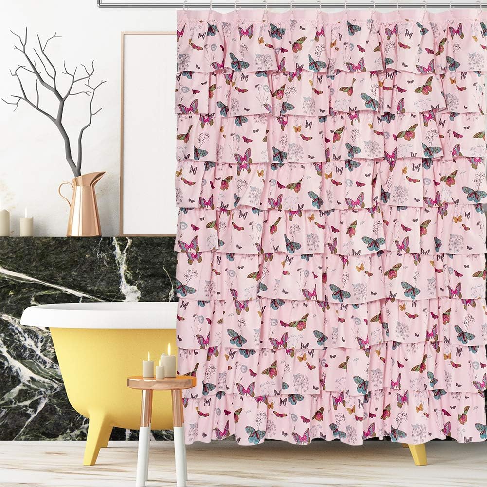 72 width x 72 length inch | Pink Butterfly Pattern | Ruffles Decor We provide 90days refund if you're not satisfied with our product. At long shower curtain,we have a passion for designing products that will enhance every area in your home and improve your family's overall well-being.We're committed to manufacturing products that use top quality materials, fashion designs and detailed finishes.Our stall shower curtain is more popular with boy, girls, boys,kids, etc Features: Premium Quality Fabric: healthy material Polyester,no chemical odors,environmental & health friendly. Fabric ruffled shower curtain: impart an air of elegance & sweet into a bathroom, Restroom,Toilet ,Guest Room etc. Microfiber WaterProof Fabric: Waterrepellent and dries quickly. Extra Free 12 plastic shower curtain hooks included,easy to install. Care instruction: Easy clean, machine wash cold with like colors on gentle cycle. Use mild detergent, and only use non-chlorine bleach. Tumble dry low and remove promptly Recommended to use with a liner recommended. Note: Due to different screen display, the colors of the actual item may vary slightly from the above images. The rod in the image are NOT included.Keep attention to the baby, kids, toddler and teens if they are playing with the shower curtain.