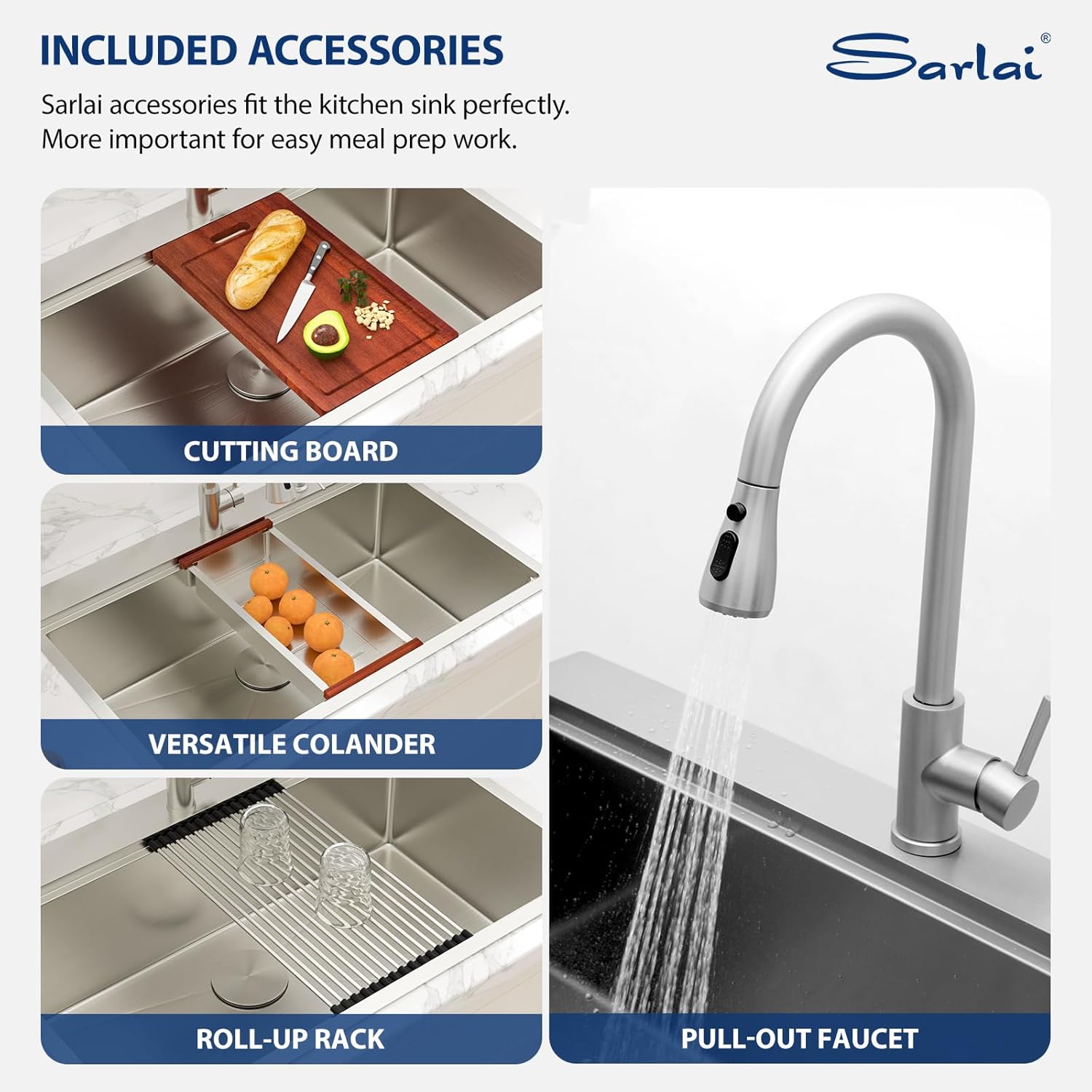 | Included Components | bottom rinse grid, cutting board, drain strainer, kitchen sink, roll-up drying rack |