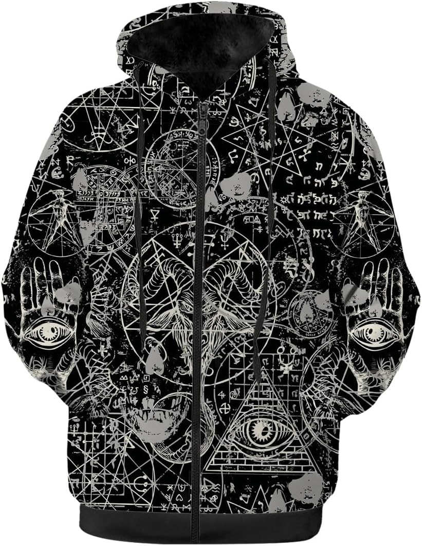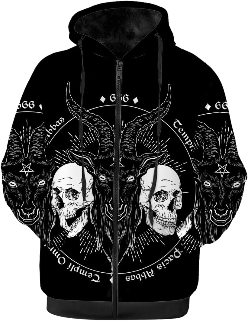 Mens womens warm winter jacket coat fleece zip-up hoodie sweatshirt-built for warmth,style and comfort.Designed for winter with warm inner layer to lock in heat,keeping you toasty during walks,ski trips,weekend hikes,family gatherings,or travels.Mens winter jacket features a full-zip closure for easy wear.Side pockets conveniently store phone,keys,or gloves.The adjustable hood drawstring provides wind protection and neck warmth.Machine-washable for easy care.Satanic jacket with soft,warm fabric provides all-day comfort.Featuring 3D print graphic offers a trendy touch to winter fashion.Hooded winter jackets make funny gifts for women,men,mom,dad,friends,boyfriend,girlfriend.This zip-up jacket suitable for leisure,work,and sports.Pairs easily with jeans,sweatpants,leggings,or casual trousers for fashionable daily looksUS sizes XS-5XL fit standard and plus sizes.Choose size for comfortable fit.Size up for loose.