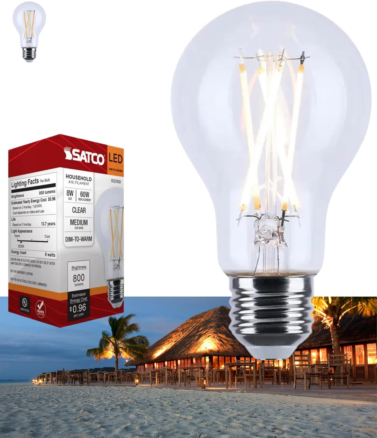 The Satco S12150 is an 8 watt LED A19 that delivers the classic look of clear glass with the modern comfort of warm dimming. At full output it delivers about 800 lumens at 3000K, and as you dim the light it smoothly warms toward 2000K to create candlelike ambience for dining rooms, bedrooms, or hospitality spaces. With 90 CRI, colors and finishes appear natural and vivid, while the wide 300 degree distribution fills lamps and fixtures evenly. Designed as a practical 60W incandescent replacement, S12150 uses a standard E26 medium base and 120V input for fast, no hassle swaps. It is rated for use in enclosed fixtures, making it a dependable choice for ceiling lights, lanterns, and decorative shades where heat buildup can shorten life in ordinary lamps. The clear glass envelope and filament style optics keep the traditional aesthetic that customers expect in visible fixtures. The lamp is dimmable for warm dimming applications and includes built in 0.5 kV surge protection. Power factor is 0.7 for everyday residential circuits. Rated life is 15,000 hours and the product carries a 3 year warranty to help control maintenance costs. Title 20 listed, cULus safety listed, FCC compliant, and RoHS conformant, S12150 brings high quality, warm atmosphere lighting to daily living at a fraction of incandescent energy use.