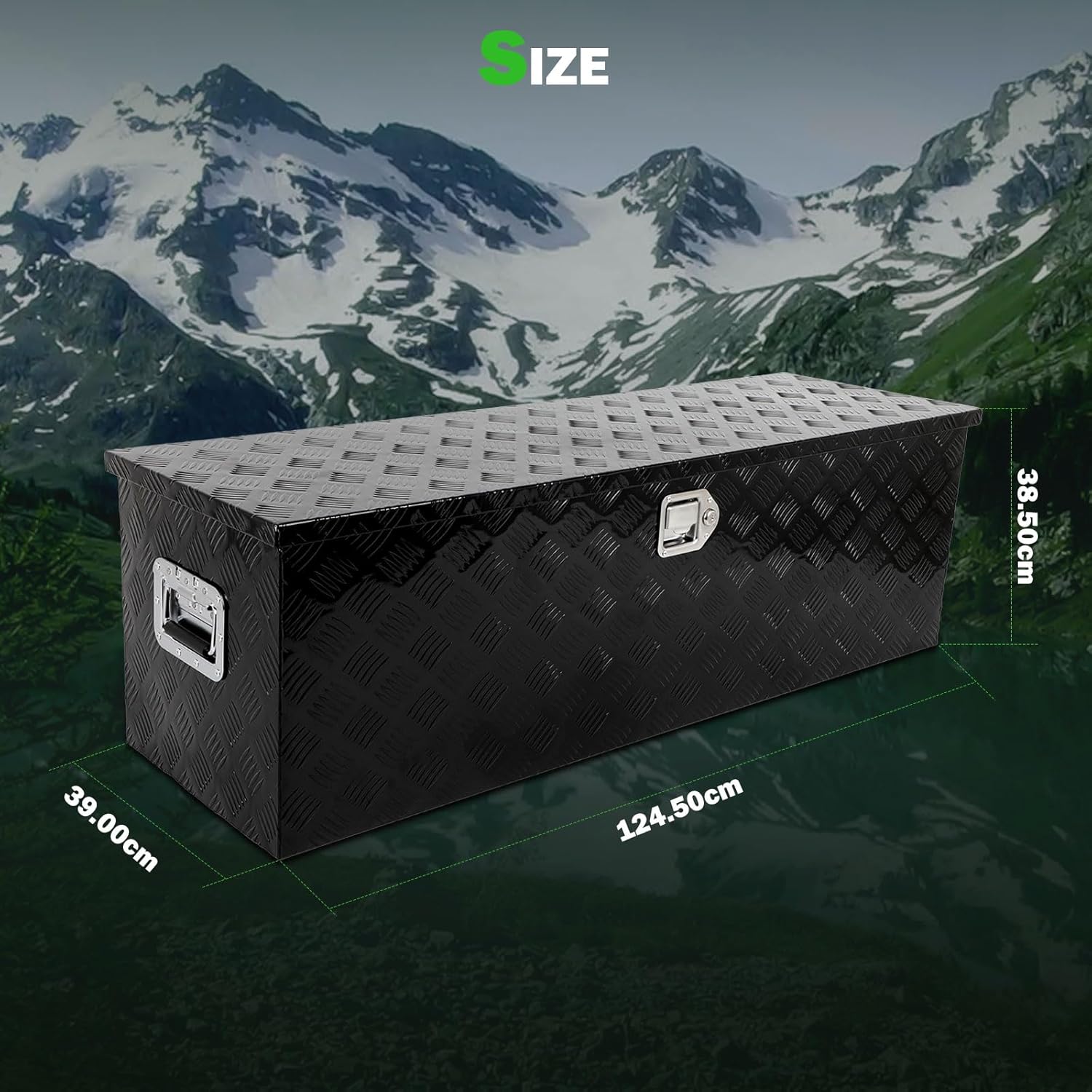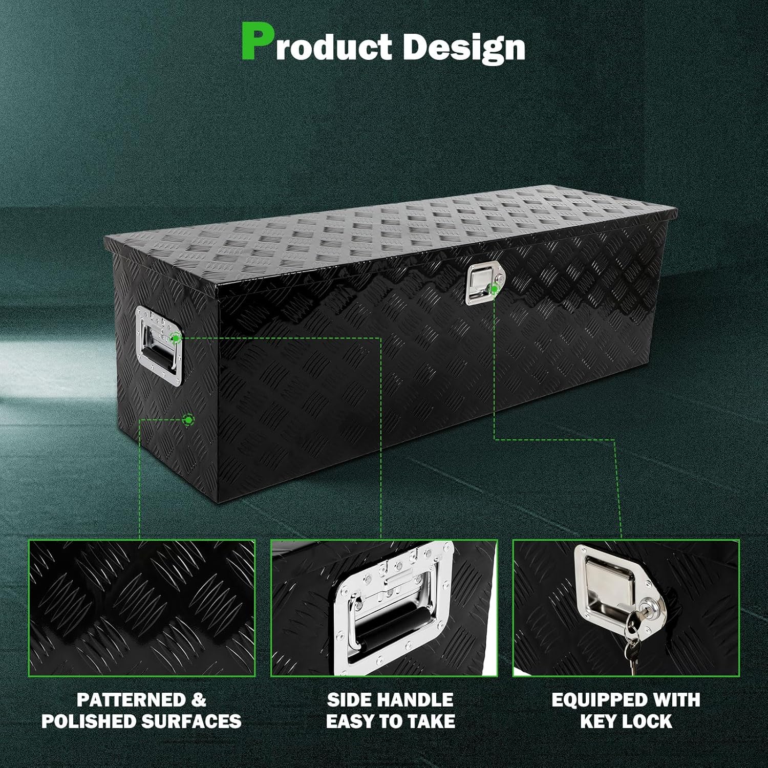 Tips for choosing a Truck Bed Storage Box When considering a toolbox or storage box for pickup truck beds, you should factor in the available space, the amount and size of the contents you plan to store in the box and the level of security you require. We stock a variety of designs that will keep contents dry and protected from direct sunlight. You can also choose a locking pickup bed storage box.Enhance Your Truck Bed It carries a wide selection of utility truck bed parts to add functionality to this part of your vehicle. From bed liners to storage boxes, you can find everything you need to protect your truck and your tools. You may want to take some measurements ahead of time to make sure that components or accessories will fit your truck bed.Truck Bed Utility Storage Boxes Carry and protect gear or tools in a truck bed utility storage box. These boxes enable you to transport and access parts while protecting the contents from being seen, stolen or damaged by the elements. Specification: Part Name: Aluminum Truck Tool Boxes Location: Universal Color/Finish: Black Fitments: Universal Fit for most of TrucksPackage: 1X Truck Bed Storage Box