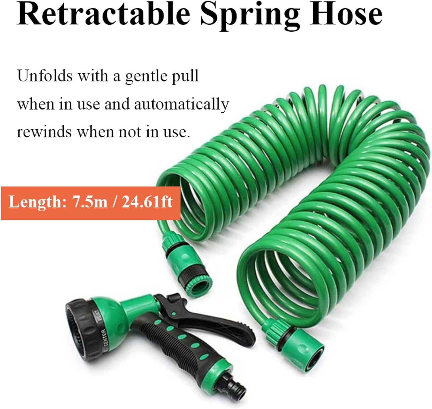 Feature:7 Water Spray ModesThe coil hose contains a multi-functional hose nozzle with seven different spray modes clearly marked on the nozzle: jet, shower, flat, cone, soaker, mist, center.Users can easily switch to the desired spray mode with a simple turn of the nozzle head for a precise and efficient watering experienceFlexibleThe water hose is made of coil spring telescopic structure, which can be retracted at will. When in use, the water hose can be unfolded with a gentle pull, without the need for tedious installation. When not in use, the hose can automatically shrink to a short state with the help of spring characteristics, easy to organize and store, saving spaceEVA MaterialThe shell of EVA coil garden hose is made of EVA material, with good softness and elasticity, which makes the coil garden hose be bent and stretched but not easy to be broken. It has good weather resistance, which can withstand the sun, rain and other natural environments, and is not easy to aging or damageQuick ConnectThe coil hose is equipped with 3/8 quick couplings, which makes connecting the water gun and faucet fittings very easy and fast. Users do not need to worry about the connection problem. Simply plug it in gently to realize a solid connection, which greatly improves the efficiency of useWidely ApplicableThis 7.5m/24.61ft hose is long enough to easily cover a wide range and meet the watering needs of different areas. It is very suitable for garden watering, and can also be used for farm irrigation, aquarium water exchange, home car washing and many other occasionsSpecification:Name: Coil HoseMaterial: EVAColor: GreenLength: 7.5m / 24.61ftPackage Included:1 * Coil Hose