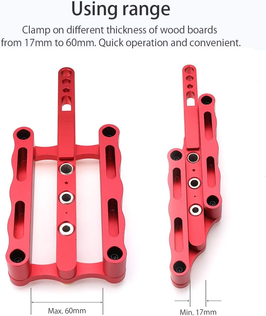 Description: Self Centering Dowelling Jig Metric Dowel 6/8/10mm Drilling Tools for woodworking Specification: Materialaluminium alloy 6061 Surface treatmentanodic oxidation treatment Material of drill bushingSteel HRC50° Positioning dowel6/8 /10mm Suitable wood size17-60mm Adjustment nutBrass nuts Features:1. High-quality and Durable Material--The joinery punch locator is aluminum alloy 6061+steel HRC50(drill bushing)+brass (nut). High hardness, quality assurance, durable and long service life.2. Surface Treatment--Anodic oxidation treatment. Anodic oxidation treatment surface & Steel HRC50° material ensures good work performance and helps to improve efficiency.3. High Precision--The joinery punch locator provides improved version comes with 6mm, 8mm and 10mm bushings and 1mm and 2mm scoring hole for making different sizes of holes.4. Adjustable Stop--The joinery punch is specially prepared adjustable stop and drill accurately, which can drill equally space hole along the wood.5. Convenient and Practical--With the practical joinery punch locator, you can more conveniently work for woodworking. It is a great set tool for both furniture factory and woodworking enthusiasts.Package Included:1 x Locator3 x Pin9 x Drill Sleeve