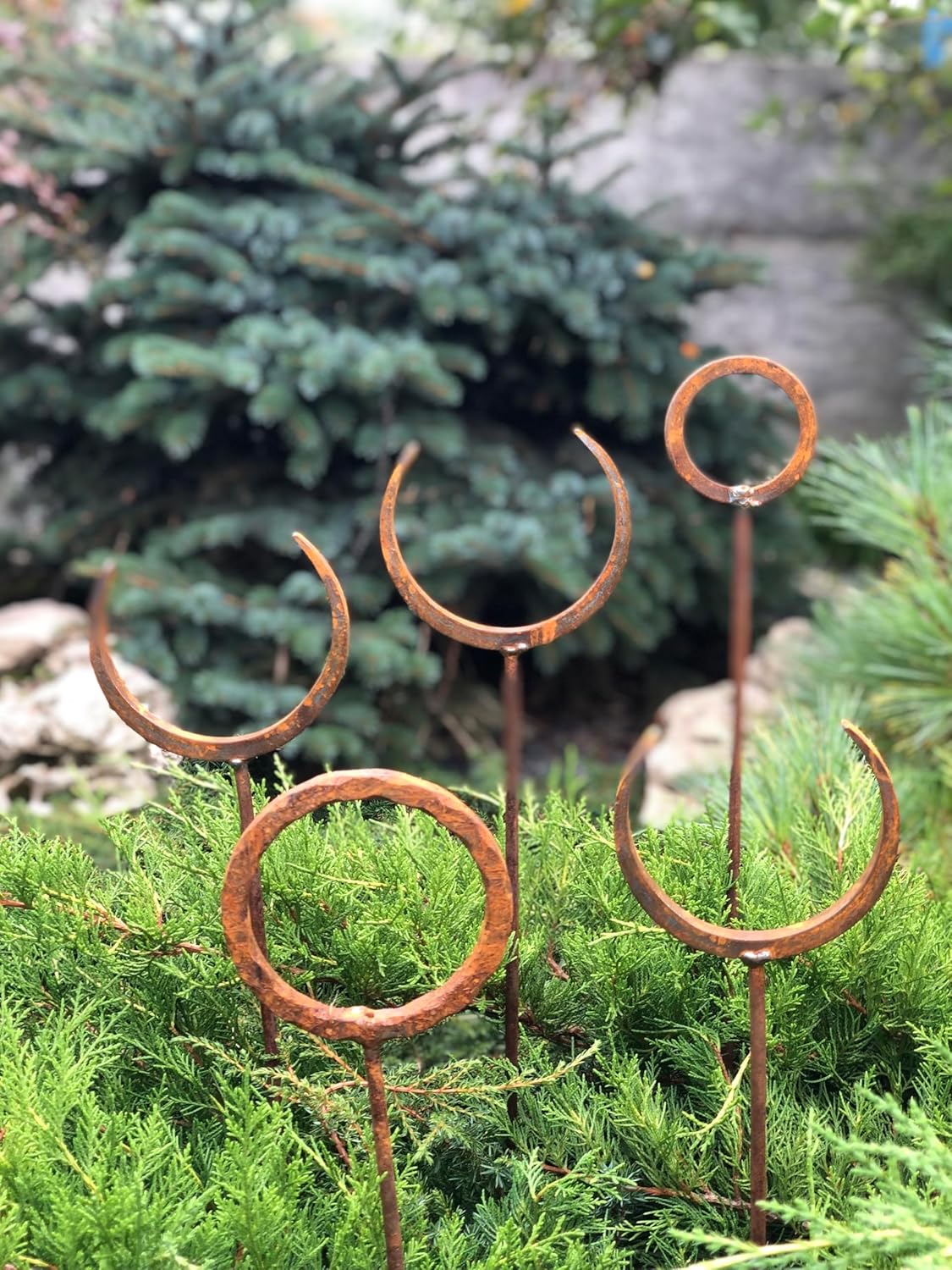 This Rustic metal garden finials set of 5 will place decorative accent in the garden compositions and landscape, create an atmosphere of romance and coziness in your home. This rusty metal art could be used as decoration at your home, in your garden, backyard, terrace or entrance to your home. This yard decor made from natural metal and it covered with a natural rust. This rusty garden decor can be used all year round, it is not afraid of precipitation, direct sunlight, etc.
