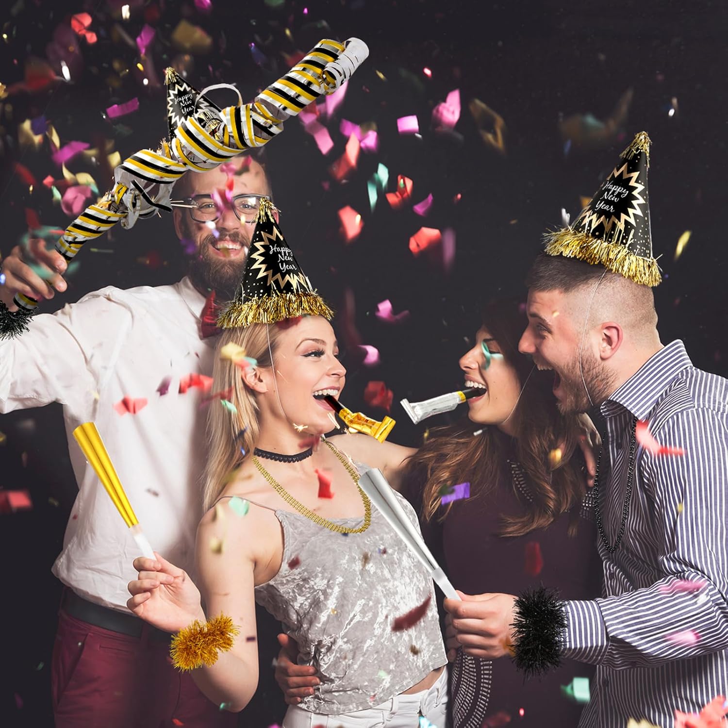 Features: Ideal gift: You can give these exquisite sets as a gift to friends, guests or family, and take them out on New Year's Eve and say "Happy New Year", letting them be the queen of the party or the center of the room. More occasions: The 2026 party decor kit is suitable for new year party decorations, and other special occasions, such as costume it for a black tie New Year wedding, and it really fit the bill. Specifications: Main material: plastic, paper, foil, aluminum Main Color: gold, silver, black Size: Conical hat: about 7.9 inches/ 20 cm in height, 8.7 inches/ 22 cm in base diameter Tiaras: about 7.5 inches/ 19 cm in height, 5.1 inches/ 13 cm in width Package: 12 x Cone hats 12 x Happy New Year tiaras 8 x Blowouts 8 x Foil horns with mouthpieces 8 x Metallic tassel blowouts 12 x Beads necklaces 12 x Leis necklaces 24 x Leis wristbands 6 x Aluminum films Warm notes: Manual measurement, please allow slight errors on size. The color may exist slight difference due to different screen display. Little ones should use the product under the supervision of adults. Small items, please keep the products away from kids to avoid choking risk. Winding risk, keep away from little kids.
