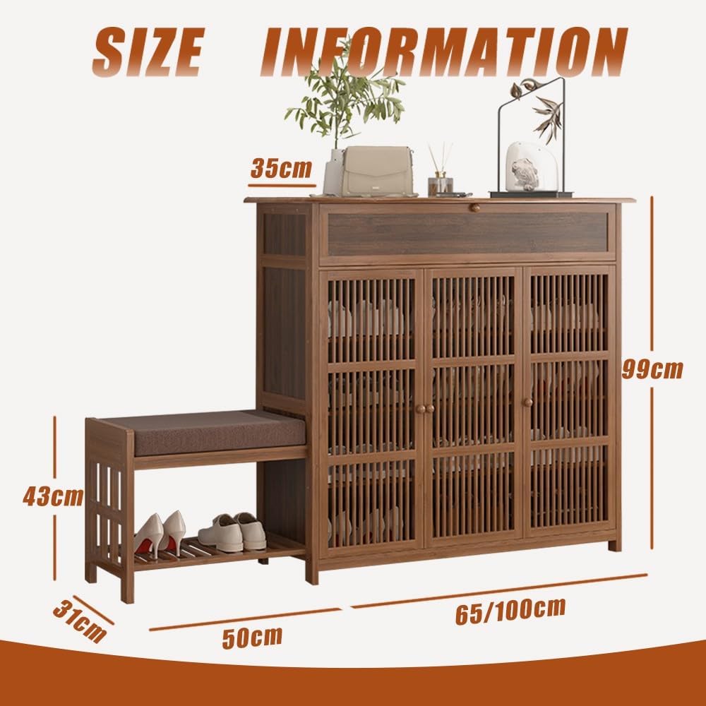 Introducing our stylish multi-functional shoe cabinet, designed to enhance the nization of your entryway while complementing modern home aesthetics. This cabinet is perfect for families seeking both functionality and elegance in their living spaces. **Key Features:** 1. **Comfortable Shoe Bench:** Equipped with a high-density sponge cushion, our bench offers long-lasting comfort, making it a perfect spot for putting on or taking off shoes. Its ergonomic design ensures a pleasant experience even after extended use. 2. **Dust-Proof and Ventilated Cabinet Doors:** The thoughtfully designed cabinet doors feature a grille that effectively minimizes dust accumulation while promoting air circulation. This keeps your shoes fresh and ready to wear, enhancing their longevity. 3. **Versatile Flap Door Storage:** The ample storage space is ideal for keeping daily essentials nized. Use it to stash shoes, umbrellas, or other items, ensuring your entrance remains tidy and clutter-free. **Specifins:** - **Color:** Walnut - **Dimensions:** Available in 65 cm and 100 cm - **Material:** Durable bamboo - **Assembly:** Some assembly required for ease of transport and setup **Package Includes:** - 1 x Shoe Storage Cabinet - 1 x Assembly Instructions Please note that actual product colors may slightly differ from those shown in images, and minor size variations may occur due to manual measurement. **Customer Care:** We prioritize your satisfaction. If you encounter any issues during use or receive a missing part, please reach out to our dedicated customer support team, who will respond within 24 hours to resolve your concerns. Transform your entrance with this functional and attractive shoe cabinet, making it a valuable addition to your home.