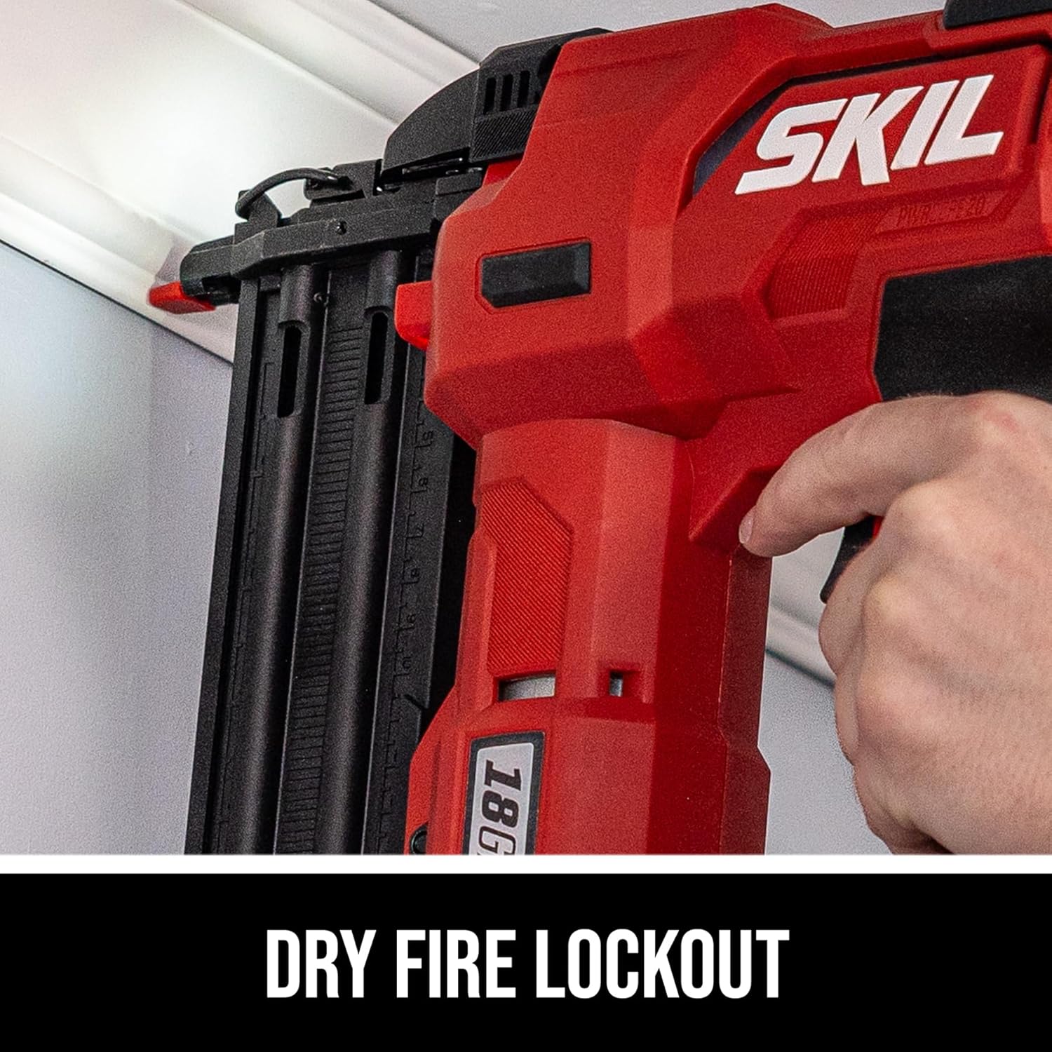 Ditch the hoses and compressors with the cordless SKIL PWR CORE 20™ Brushless 20V 18Ga Brad Nailer Kit. This 20V cordless nailer delivers best-in-class runtime by driving up to 1,000 nails on a single charge with the included 2.0Ah battery. It features a powerful brushless motor that drives up to two nails per second with minimal ramp-up time. Dual LED lights help increase visibility when working with the nail gun in dimly lit work areas. Its quick depth adjustment wheel allows you to easily set the ideal nailing depth when driving fasteners, and the battery-powered nail gun is compact and lightweight for working in tight spaces with minimal fatigue. Choose between sequential and bump modes with the mode select switch. Dry fire lockout eliminates blank firing and prevents damage to work surfaces, while tool-free jam clearance offers easy access to clear nails in case of a jam. The finish nailer accepts 5/8-inch to 2-1/8-inch 18-gauge fasteners.