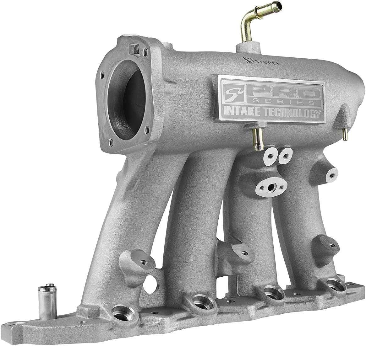 Skunk2 Racing's Pro-Series Intake Manifold improves airflow thus increasing horsepower by as much as 8 percent over stock manifolds on stock engines and even more on modified or forced-induction engines. Skunk2 manifolds significantly increase horsepower between 3000-8800 rpm; the broadest powerband increase in the industry. Skunk2's new Pro-Series design features a 22 percent increase in power over the previous design. Engineered with a larger plenum and tapered runners, Skunk2 manifolds increase and accelerate airflow, and are designed to increase the effects of wave scavenging at the engine's optimum operating RPM range providing a broad overall increase in usable power. Each runner entry is also modified to balance airflow between cylinders. Oversized throttle bodies can be used as a result of the modified IAC opening on the flange. Like OEM factory manifolds, Skunk2 manifolds are shell molded and CNC machined, to achieve superior strength, high-quality finish, and a precise fit. Each manifold is vacuum tested to ensure quality and leakfree operation. The Skunk2 Pro-Series manifold utilizes all stock sensors and auxiliaries for a simple bolt-on installation that delivers maximum power. Made from high-grade 356 aluminum and features OEM quality shell molded casting.