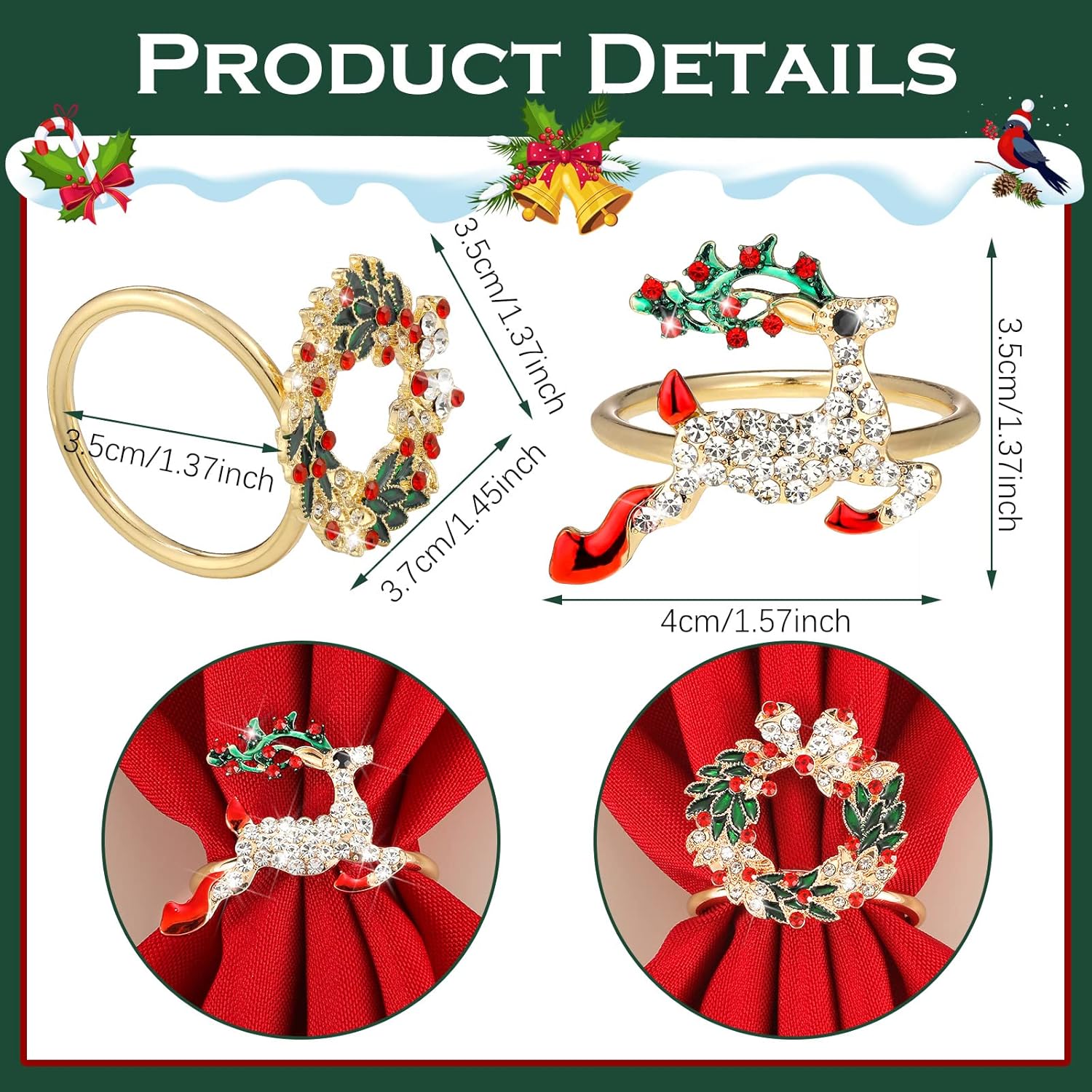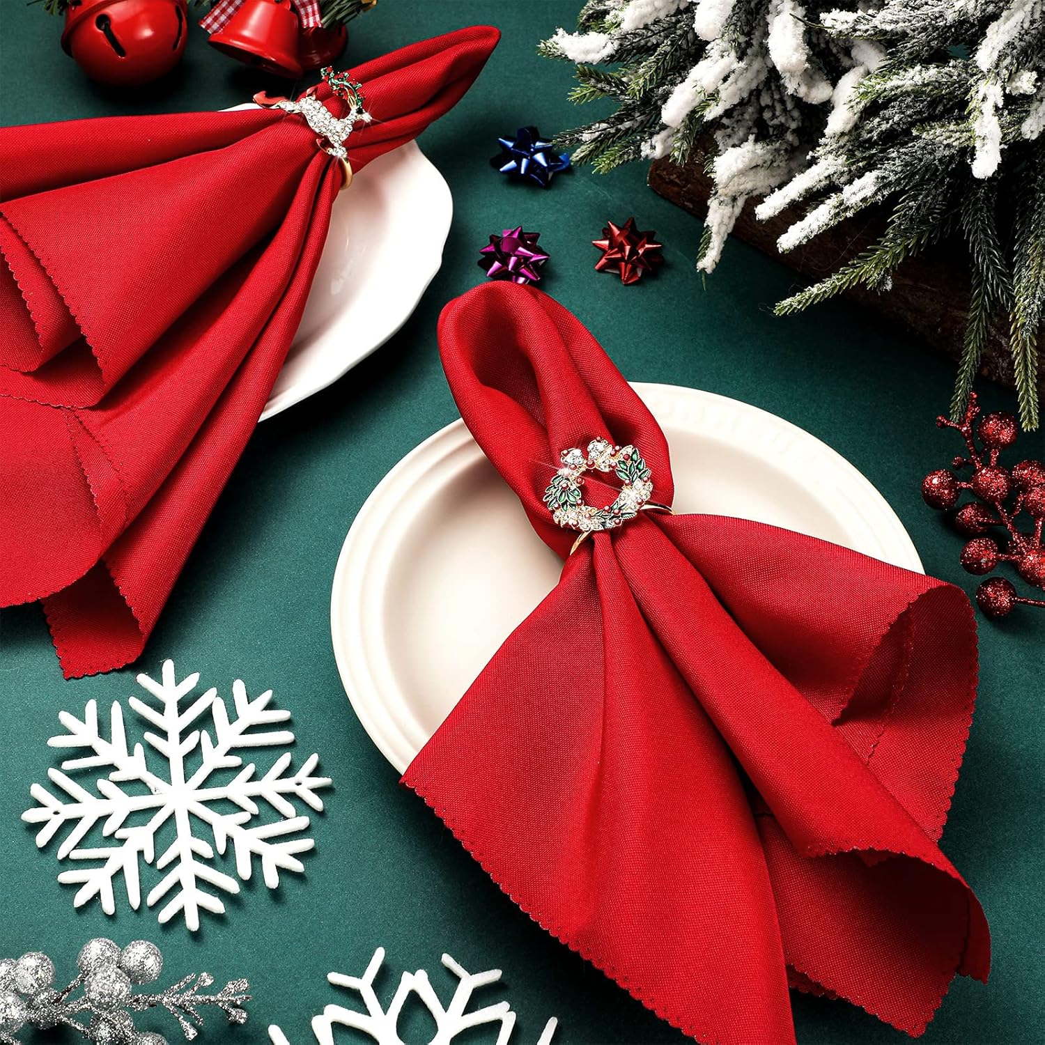 Features: Ideal gifts: Each pattern is filled with the festive atmosphere of Christmas, make your Christmas dinner leave beautiful memories. Christmas napkin rings set also can be as a thoughtful gift for Christmas, housewarming, and more. Easy to clean: If the Christmas napkins holder is dirty, you can wipe the napkin ring with a wet sponge or wet cloth, then dry it with a soft dry cloth. When the dinner is over, you can clean it and save it for the next time using. And it's also a decoration to put in your home. Easy to use: Xmas napkin rings can help you fix the napkin, which are convenient for you to pick up or put back after use. In addition, the fingerprints on the napkin ring can be easily wiped off after use, and the holiday red napkins can also be washed with water for you to use repeatedly. Material: Napkins: polyesterRings: metal and rhinestonesSize: as the picture showsColor: as the picture showsPackage includes: 12 x Christmas fabric napkins12 x Christmas napkin ringsNotes: Manual measurement, please allow slight errors on size. The color may exist slight difference due to different screen displays.