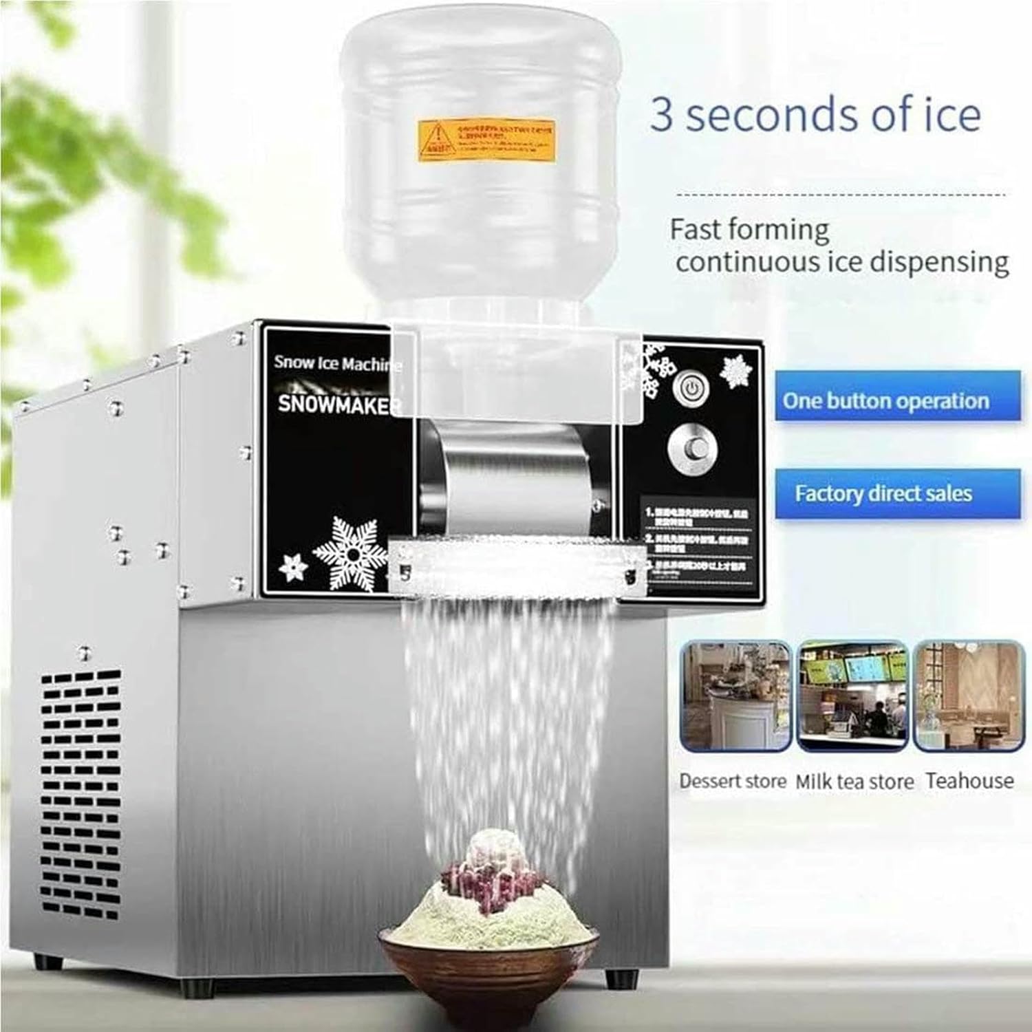 • Multi-function:Intelligent snowflake ice maker, automatic and continuous ice making, 3 seconds fast ice making, powerful motor, one-button cleaning, adjustable ice making speed, good ice quality, delicate and silky, thick taste.