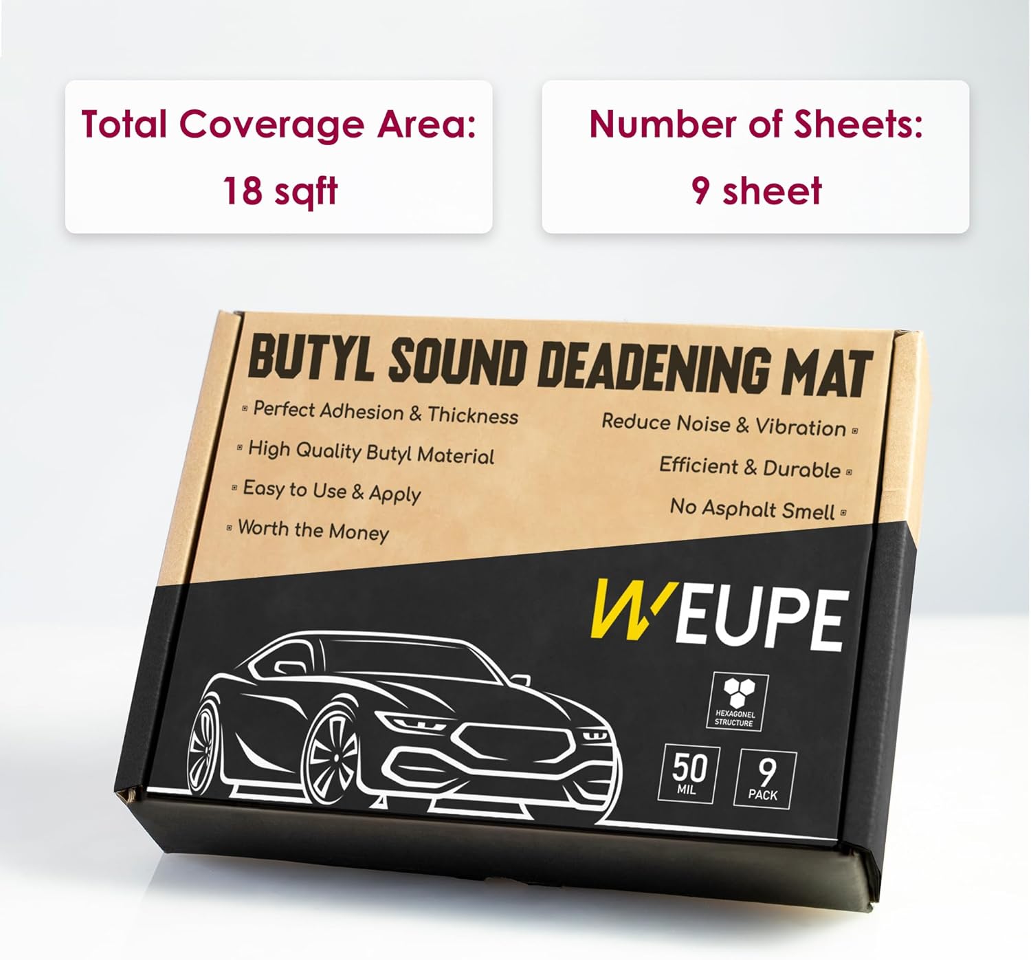 WEUPE Sound Deadening Mat for Cars, 50 mil 18 sqft, Butyl Automotive Sound Deadener, Noise Insulation Dampening Material for Car Trunk, Speaker, Door, Floor and Ceiling, Silver