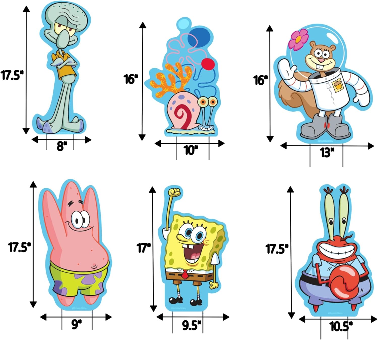 Have a spongetastic celebration with this 6 Piece SpongeBob Squarepants Yard Sign Kit officially licensed by Nickelodeon! Your favorite characters from Bikini Bottom are here and ready to party! Our Yard Sign Kit makes a bright attraction to let someone know you cherish their day. Not only are these great for the yard, but the signs can be held in a car parade or used indoors when you get creative! The characters are made from moisture resistant plastic corrugate with a colorfully printed laminated paper overlay. For best results and to extend the life of your product, our recommendation is to put the signs up on the day of your occasion and do not leave outdoors overnight. As an alternative, these signs can be used indoors without the stakes - just lean them or mount them with your favorite mounting adhesive around the gift table for a fun display. This set offers a great value for your occasion and a most unique way to express your sentiment. Imagine how surprised your loved ones will be when you decorate for them inside or outside! Metal stakes are included for outdoor use in dry conditions. Gently push two stakes into each of the corrugate signs first, then into soft soil for an outdoor surprise! Customize your arrangement of these signs easily to make them fit perfectly into your yard or garden configuration. Easy assembly and reusable with proper use and storage. Metal stakes are included for each character. (Warning: This is a not a toy. Item is not fire, wind, or moisture proof.)