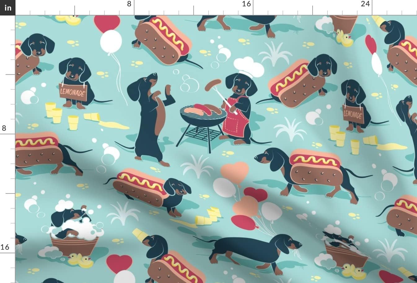 Spoonflower Fabric - Hot Dogs Lemonade Aqua Blue Doxie Dachshund Summer Barbecue Printed on Minky Fabric by The Yard - Sewing Baby Blankets Quilt Backing Plush