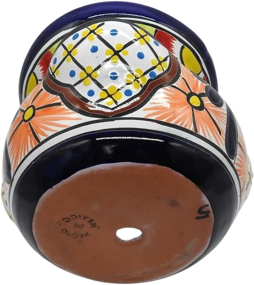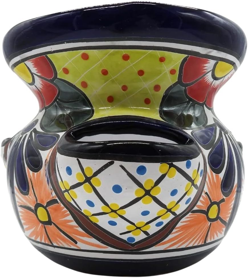 All of our Talavera pottery is handmade and individually painted using lead-free pigments and glazes. The process is extremely precise and involved taking 4-8 weeks to create each piece. As a result, each piece varies slightly in color, shape and design. Occasionally, you will notice a small paint smudge, fingerprint or other "imperfection". These are all signs of authenticity and character reminding us of the human hands that formed it. Talavera pottery is not frost or freeze proof and must be taken indoors before the first frost. Talavera pottery does not like to sit in water, get hit by your sprinklers or be in a greenhouse. Over time, small lines may appear on the blue portion of your Talavera pottery. This aging process is called crazing and does not affect a piece's durability. You can minimize crazing by avoiding drastic temperature changes, saltwater and well water.