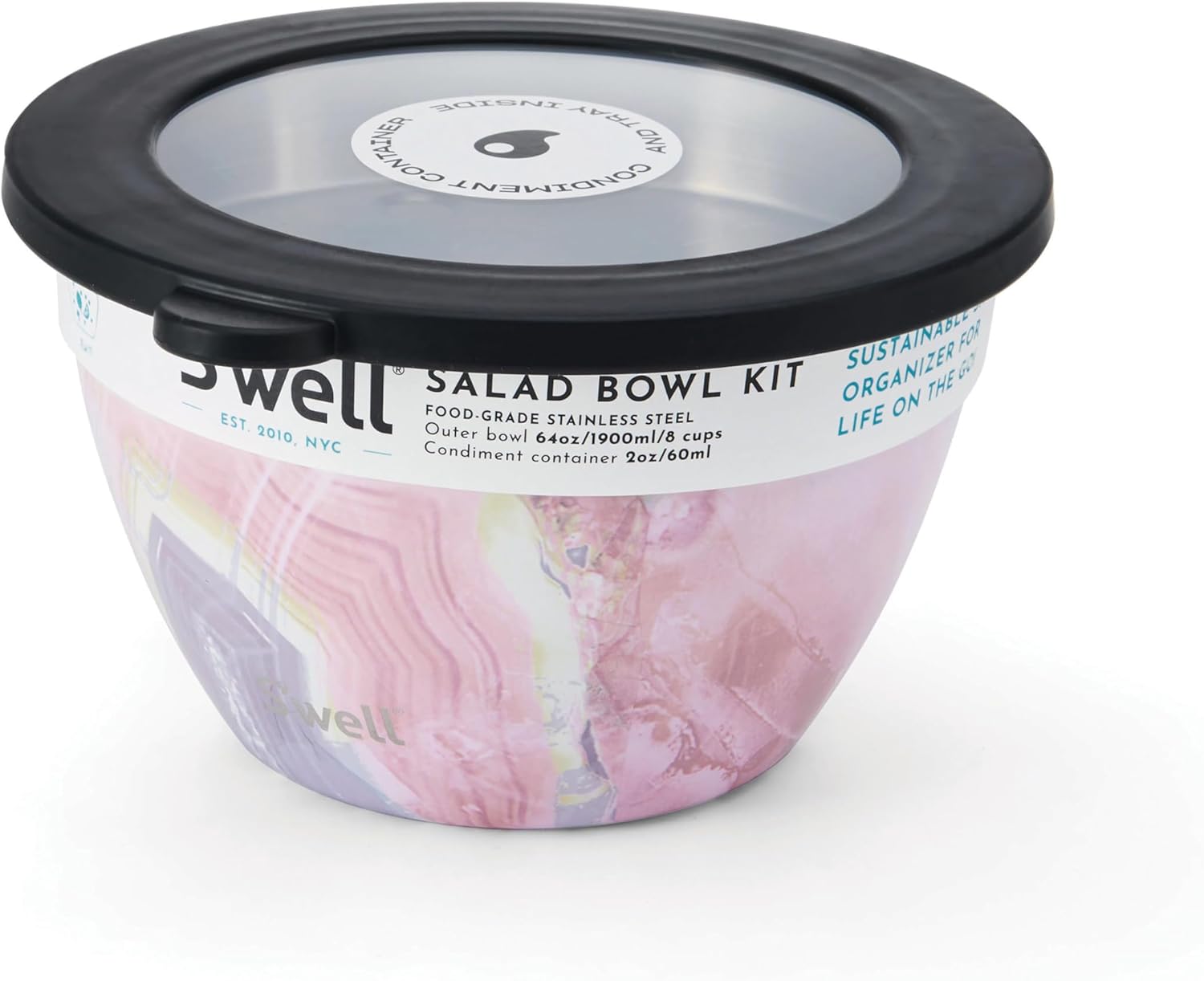 The S'well Geode Rose Salad Bowl Kit highlights the natural mystery of the rose quartz geode stone, which is known to bring unconditional love. Inspired by nature, the Elements collection features a shiny, high-gloss finish that mimics the lustre and sheen of organic materials. Not only does it help you stay organised while eating on the go, but it also looks stylish and is secure enough to stow in your handbag when commuting without having to worry about unfortunate spills. Upgrade your salad in organised style with the all-in-one Salad Bowl Kit, the perfect companion for at-home meal prep and on-the-go eating. The Bento Lunch Box Kit includes one 1.9L Salad Bowl with a total capacity of 60ml, as well as a condiment container and a removable tray. The leakproof, see-through lid and the closable condiment container help organise salad toppings, bread, sandwiches or even your reusable utensils. Suitable for short-term refrigerator storage, you’ll enjoy your salad with maximum freshness.