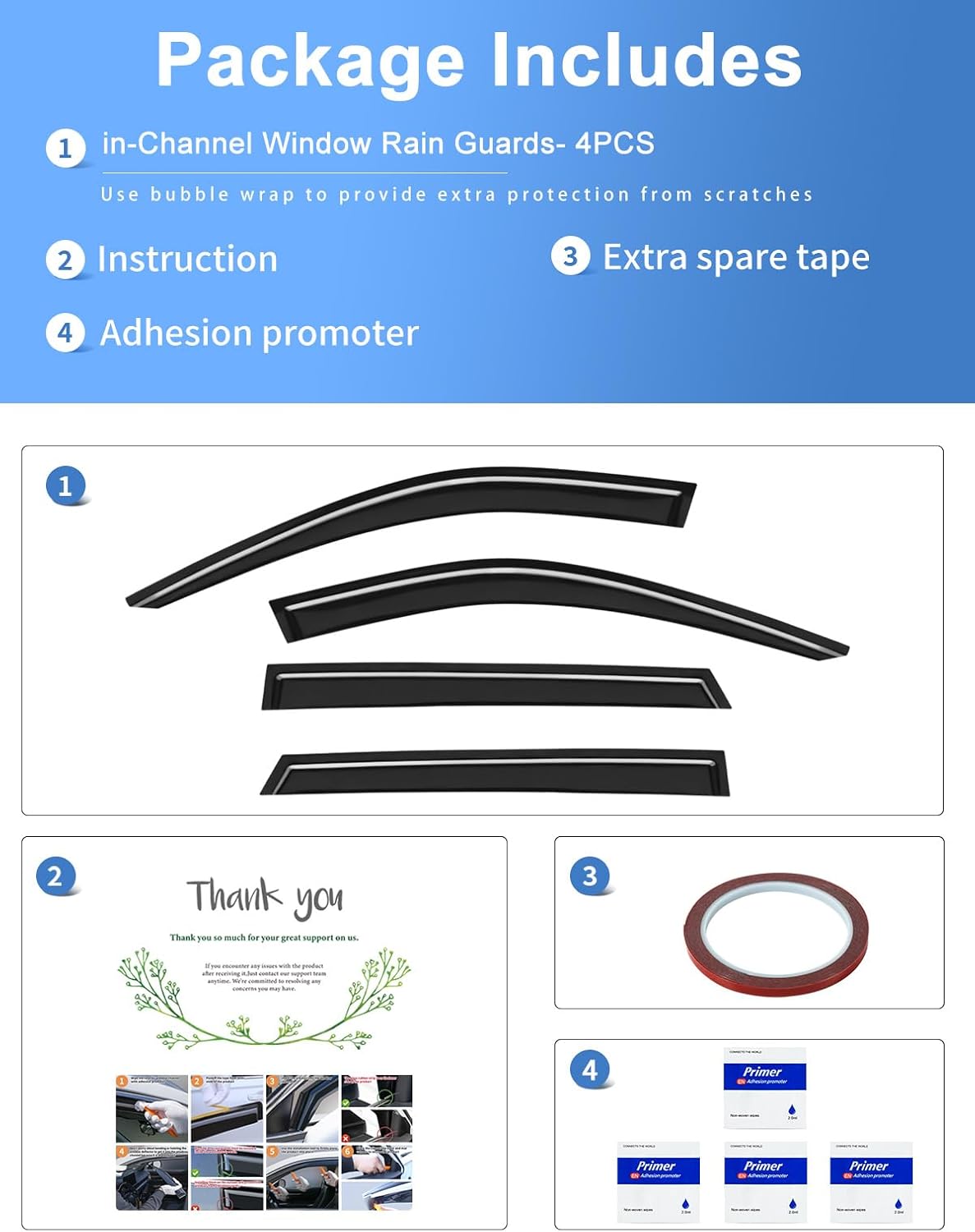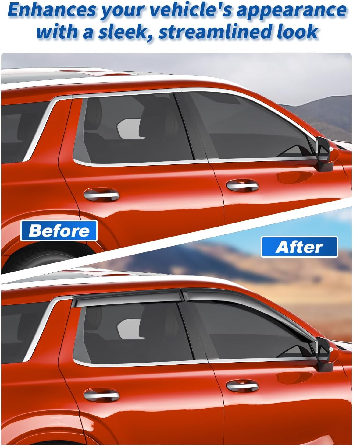 The CZShiYue Tape-on window vent visors rain guards are compatible with Hyundai Palisade 2020 2021 2022 2023 2024 2025 SE SEL XRT. If you are unsure about your trim, please contact us for instant verification – avoid costly misfit returns!Our rain deflectors are made from upgraded impact-resistant Polycarbonate (PC) and designed for extreme durability. They offer superior durability and exceptional strength compared to standard deflectors, withstanding daily use without cracking or warping. Compared to ordinary window rain guards, our advanced formula provides unmatched strength—ensuring reliable, long-lasting performance you can count on.Ditch complicated tools and mechanic fees! Our pure in-channel design with auxiliary adhesive strips enables hassle-free setup in four steps.Firstly, thoroughly wipe window channels with included adhesive promoter.Secondly, tear off the tape from both ends and gently flex the shatterproof visor into the track (safe to bend!).Thirdly, use the installation tool to firmly press the product into the designated position and secure it with the snap fastener.Forthly,close the window intermittently to ensure the rain guard properly seats flush with the window channel.Pro Tip: Keep windows fully closed for 72 hours post-installation and avoid water exposure (car washes/rain) for 24 hours – ensuring industrial adhesive cures into an unshakable bond. No more highway ejections or wind roar!