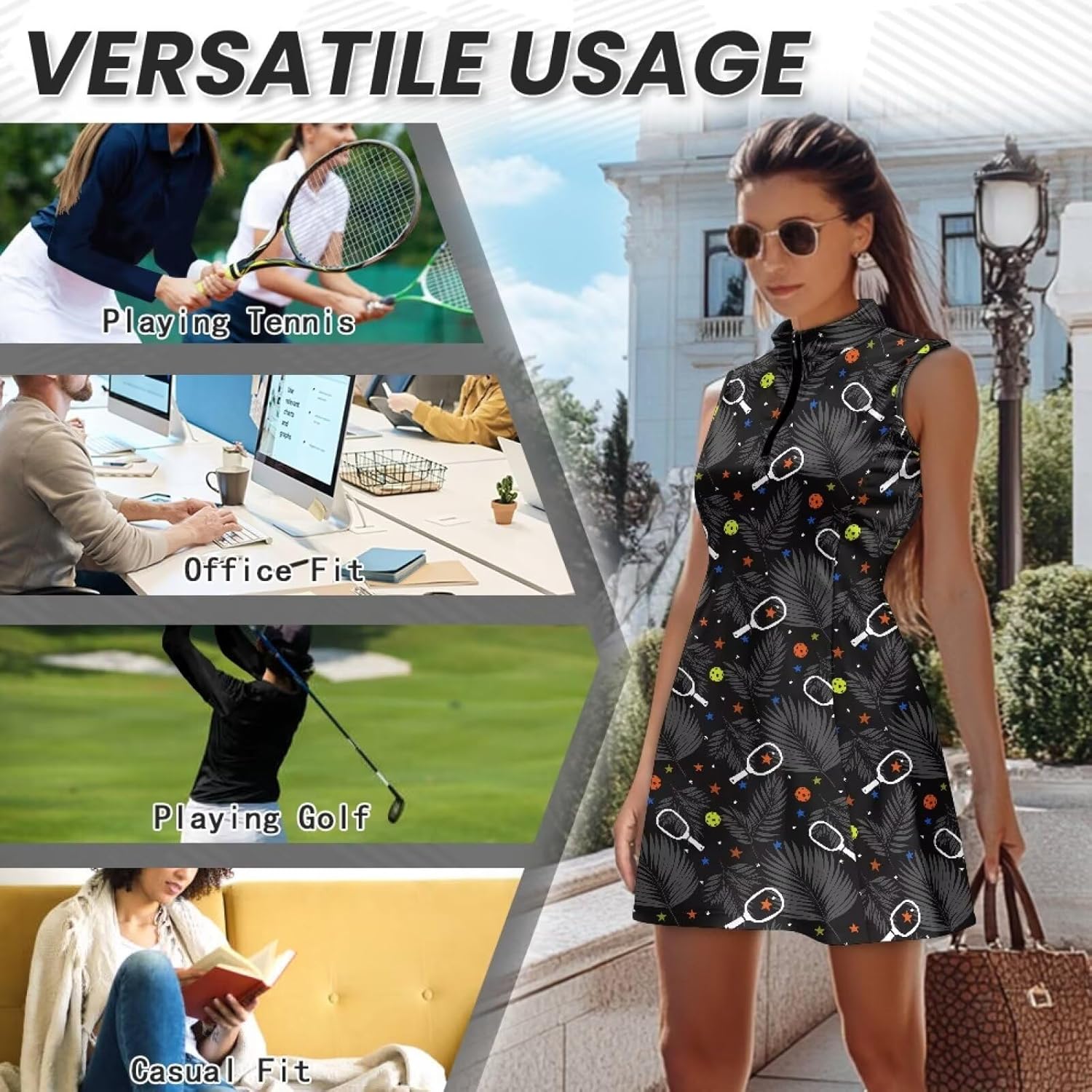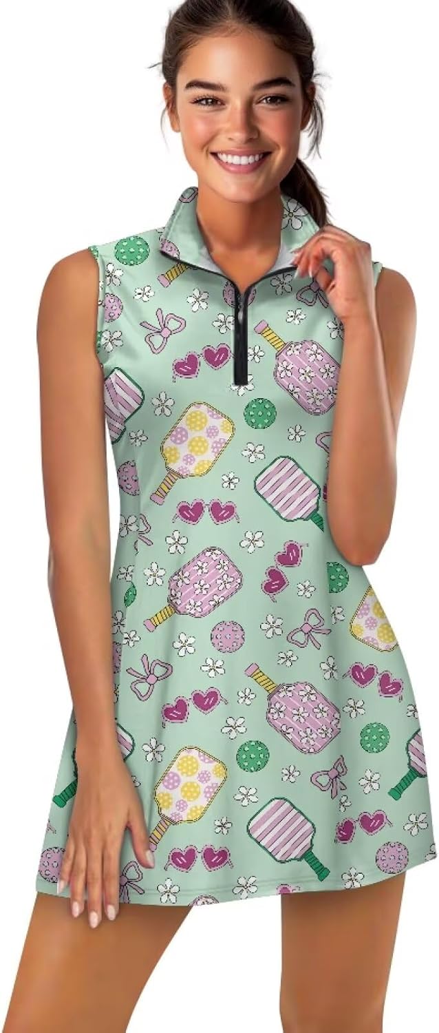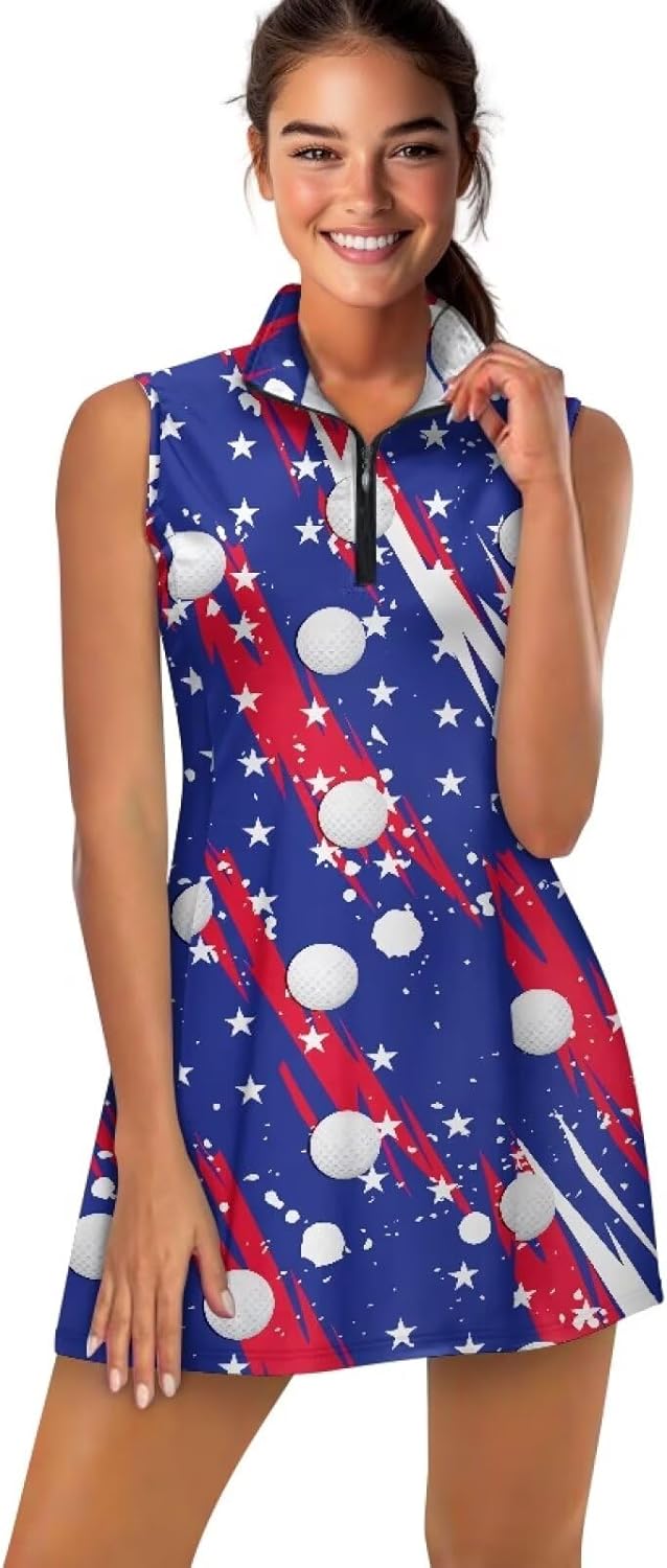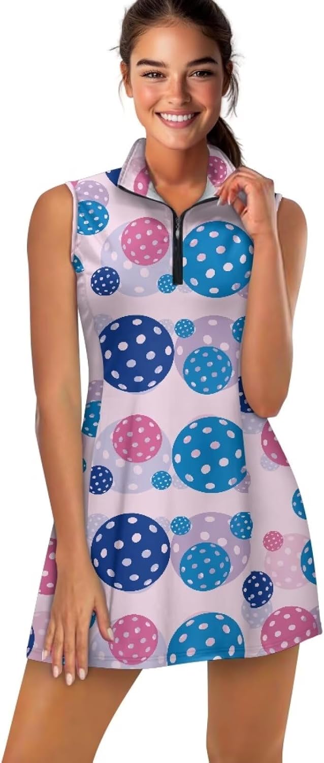 Size Information: XS: Dress: Length: 31.1’’ Bust: 32.28’’ Waist: 27.56’’ ; Shorts: Length:12.6’’ Waist:23.62’’ S: Dress: Length: 31.89’’ Bust: 33.86’’ Waist: 29.13’’ ; Shorts: Length:12.99’’ Waist:25.2’’ M: Dress: Length: 32.68’’ Bust: 36.22’’ Waist: 31.5’’ ; Shorts: Length:13.39’’ Waist:27.56’’ L: Dress: Length: 33.46’’ Bust: 38.58’’ Waist: 33.86’’ ; Shorts: Length:13.78’’ Waist:29.92’’ XL: Dress: Length: 34.25’’ Bust: 41.73’’ Waist: 37’’ ; Shorts: Length:14.17’’ Waist:33.07’’ 2XL: Dress: Length: 35.04’’ Bust: 44.88’’ Waist: 40.16’’ ; Shorts: Length:14.57’’ Waist:36.22’’ Why Choose Ours Golf Dress with Shorts >Your Versatile Companion for Active Pursuits Whether you're on the golf course, hitting the gym, training for pickleball, or enjoying a morning jog, our expertly tailored golf dress with built-in anti-chafing shorts offers the perfect combination of flexibility and security. The sleeveless design allows for unrestricted arm movement, while the high-stretch fabric naturally stretches with your swings and strides, freeing you from the constraints of traditional activewear. Thoughtful Features for Everyday Living The hidden pocket within the shorts provides lightweight storage for your essentials, eliminating the need for an extra waist bag while you move. The zip-up stand collar can be adjusted according to the weather, offering protection against wind and UV rays all in one package