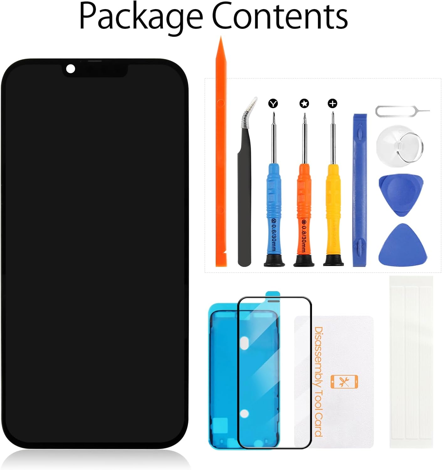 | Whats in the box | 1x triangular pry tool, 1x screwdriver set, 1x flat-dual-ended pry bar, 1x twin-sided tape, 1x dust removal sticker, 1x pointed pry tool, 1x tweezers, 1x Waterproof frame tape, For iPhone 13 Pro Max incell lcd digitizer assembly |
