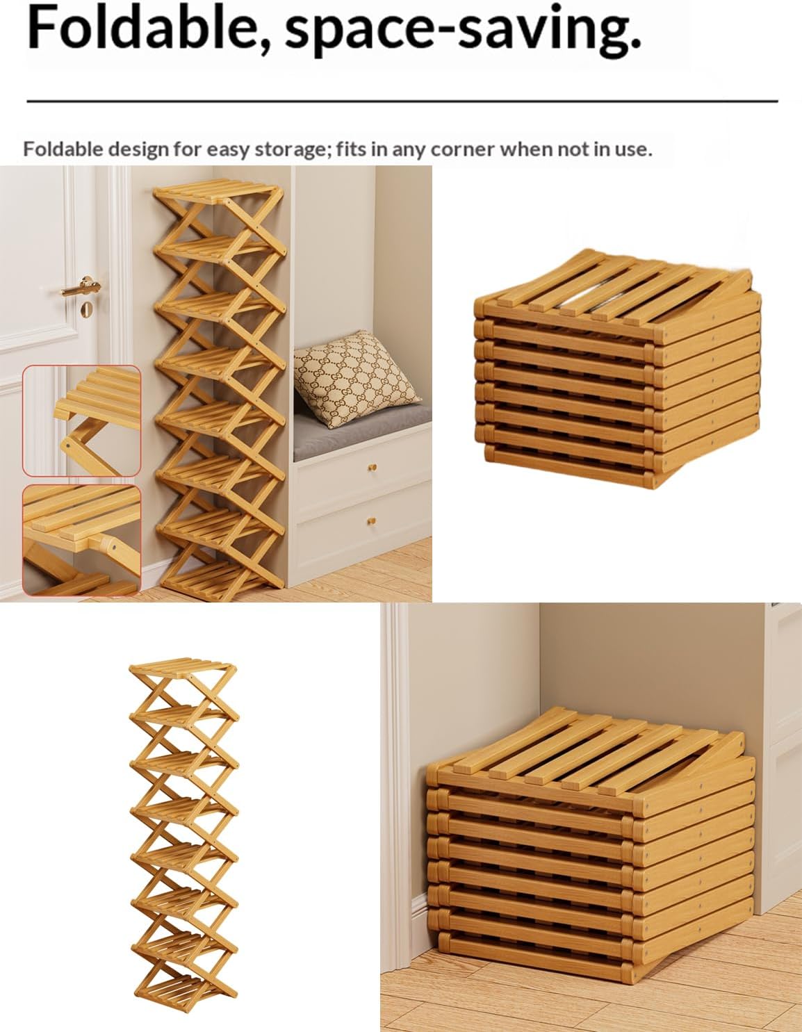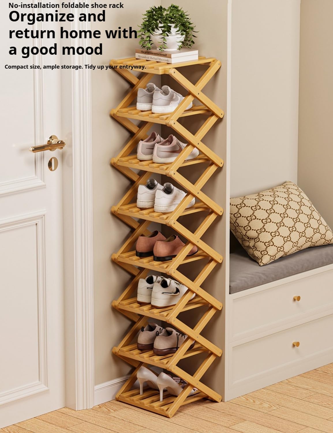 Feature: Unfolds In Seconds, No Assembly Needed Folds Flat For Storage Or Transport Narrow Space-Saving Dimensions Natural Bamboo, Rustic Finish Multi-Use: Shoes, Books, Plants Specifications: Name: The 9-Tier No-Assembly Bamboo Rack Material:Wood Color: Nature/Brown Package: 3/6/9 Tier - The 9-Tier No-Assembly Bamboo Rack 1pc Shoe Brush Notes: 1. Please Allow Slight Dimens Error Due To Manual Measurement. Thank You For Your Understanding! 2. Due To Different Monitors And Different Lighting, The Picture May Not Show The Actual Color Of The Item. Thank You For Your Understanding.