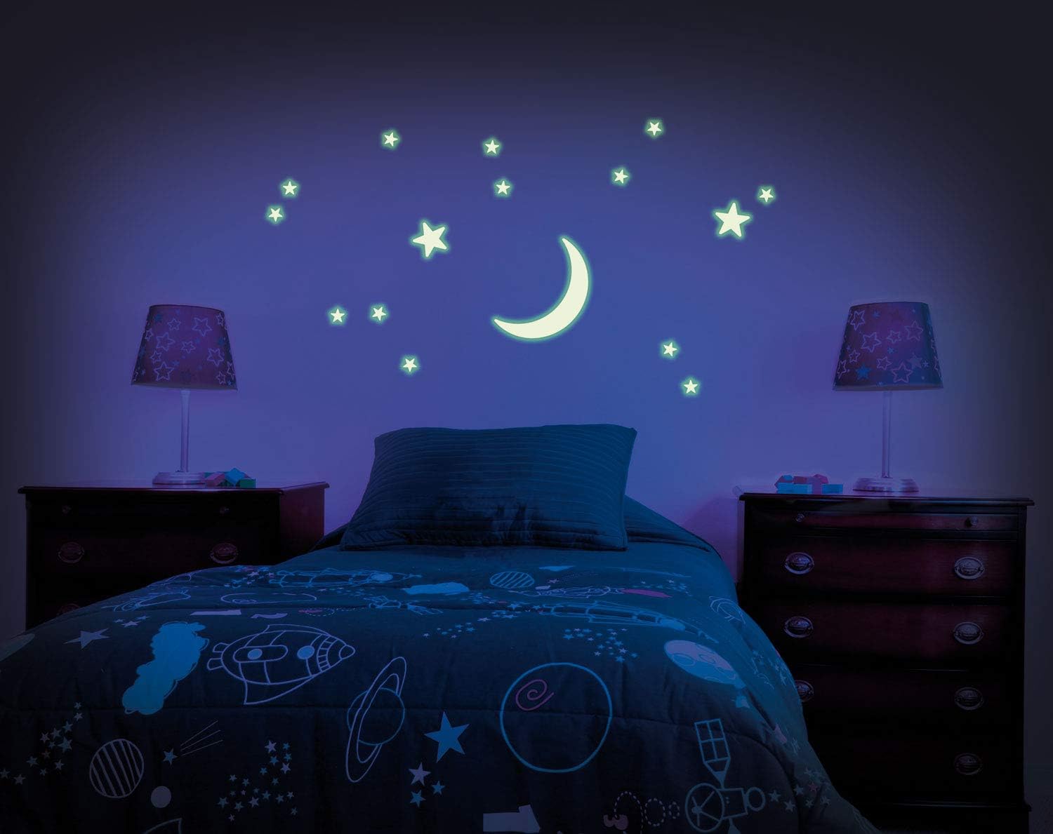 Product Description A large glowing Crescent Moon with 15 stars. The Origil Glowstars Company high-quality, plastic, glow-in-the-dark Crescent Moon and Stars. Create a magical view of the Moon and Stars on ceilings and walls using the self adhesive pads and at night-time, when the lights go out, they produce a fantastic glowing display. They can also be used to accessories school books, bags and furniture. A perfect, fun yet educatiol, gift for kids who are interested in the night sky. The Origil Glowstars Company was first formed in the 1990’s bringing Origil paper Glowstars to the tion. No home was complete without a glowing night sky on bedroom walls and ceilings. Now The Origil Glowstars Company brings, not just paper Glowstars, but a whole array of glow-in-the-dark items to make your home a fun, educatiol, “glowing” place to be. The Glow range includes The Origil Glow Stars, Glow 3D and Cosmic Glow. A perfect, fun yet educatiol, gift for kids who are interested in the stars, constellations and the Universe. Now that kids grow out of toys earlier and earlier, glow products appeal to kids into their tween and teen years. Ideal for pajama parties and sleepovers. Even adults will love to decorate rooms with this beautiful home decor. Good, educatiol family fun. Recommended for ages 3 years and up. WARNING: CHOKING HAZARD -- Small parts. Not for children under 3 yrs. Set Contains: 1 x Large glow-in-the-dark Crescent Moon15 x glow-in-the-dark stars