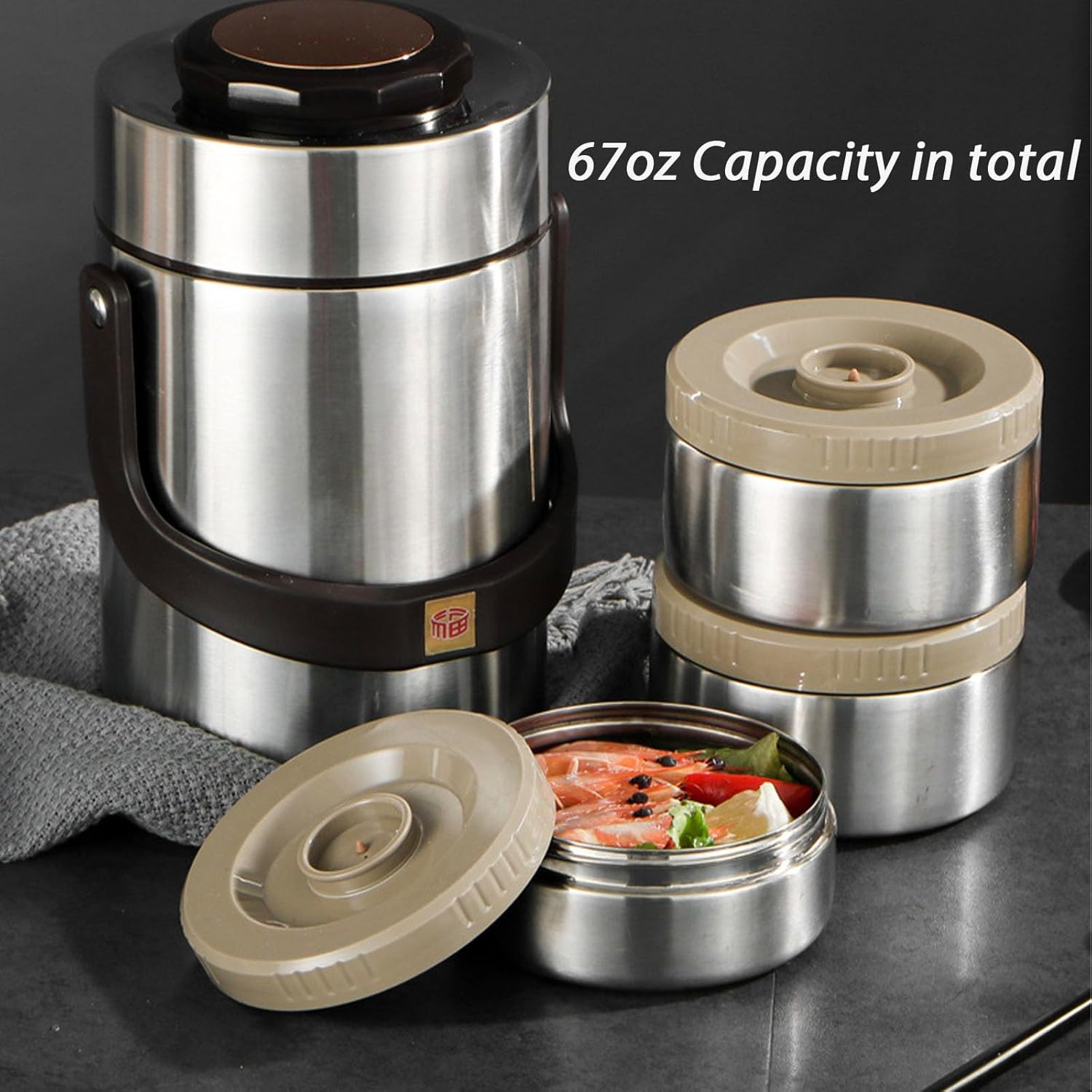 The thermal lunch box features double wall thermal insulation, effectively maintains the temperature (hot/cold) for up to 6-8 hoursThree bento boxes hold 67 oz in total, including two small compartments and one big compartmentWith seamless welding, this thermos prevents leaking and allows you to carry soupThe insulated food jar is made from BPA-free and PVC-free materials and the interior is crafted from durable 304 stainless steel, resistant to damage and wearOur insulated lunch box comes with a thermal bag for convenient transport in camping trips, picnicsPACKAGE:1* Thermos1* Bag