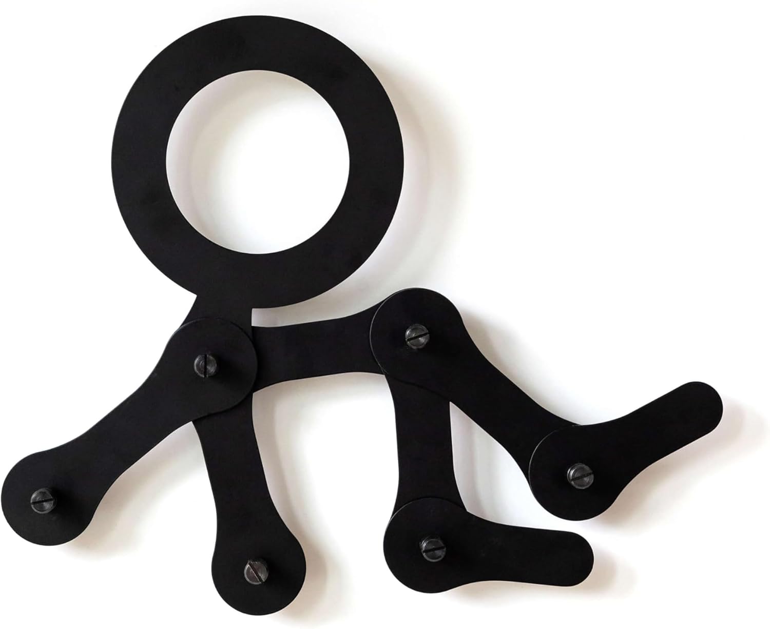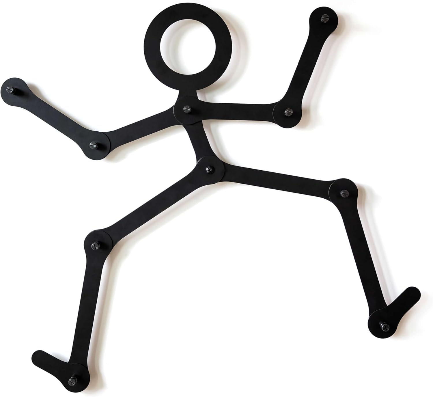 Figure it out! Meet the cat from our FITCHECK! wall rack in black metal, a purr-fectly playful and practical hanging hook solution. This wall rack is more than just a place to store your coats, hats, and umbrellas; it's a statement piece that adds personality to any room. The black powder-coated metal figure is designed to bend at the joints during installation, allowing you to customize the shape to fit your available wall space perfectly. Spacers behind the rack are deep enough for hangers and scarves, and add a visually dynamic touch.