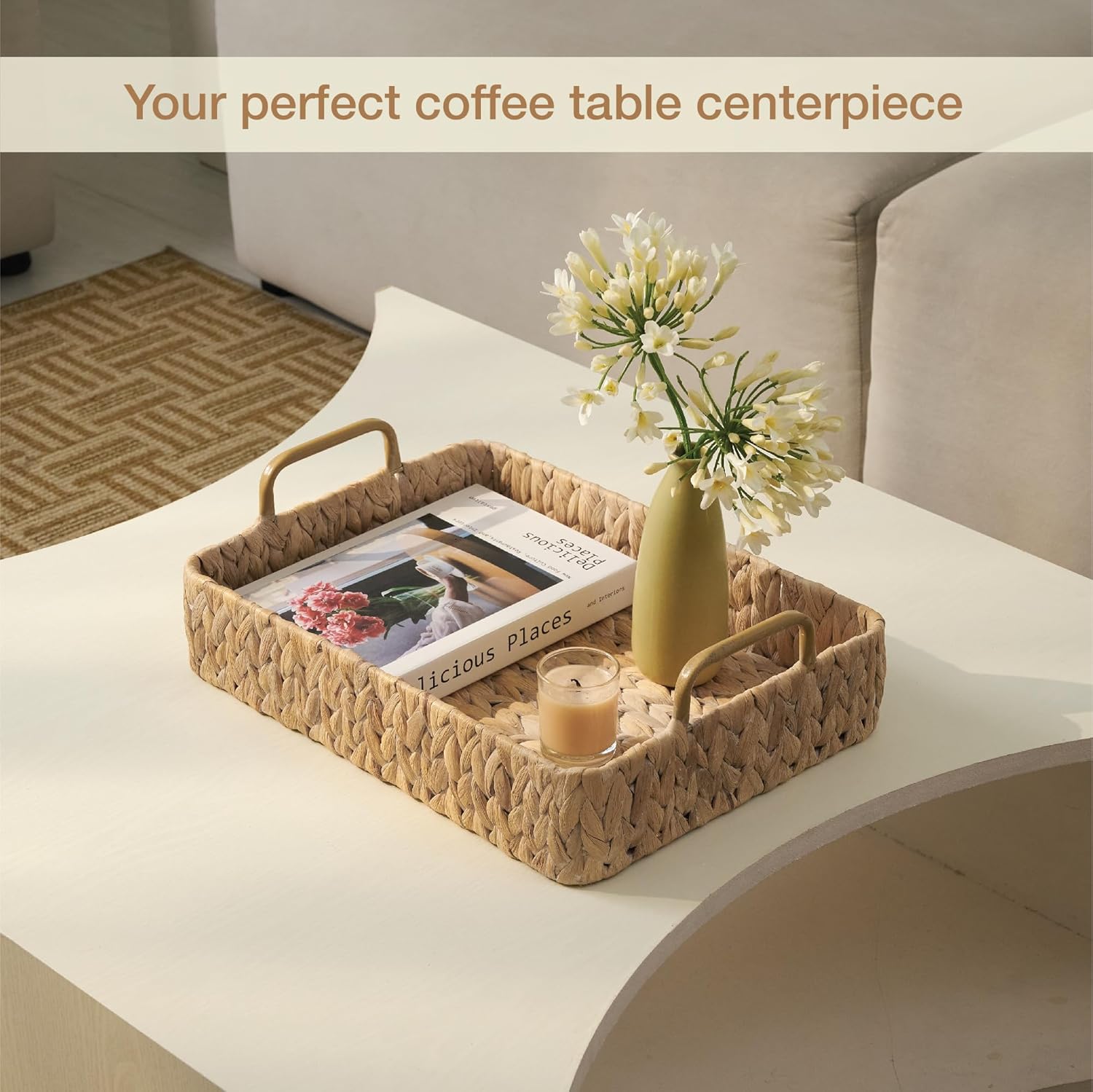 Elevate your home organization with this three-piece bundle that blends practical storage with decorative serving utility. The set includes a deep toilet paper holder basket capable of holding up to eight toilet paper rolls, alongside two shallow nesting trays featuring elevated metal handles. Crafted from whitewashed water hyacinth, these pieces offer a cohesive way to tidy up the bathroom while simultaneously styling coffee tables, ottomans, or dining surfaces with natural texture.