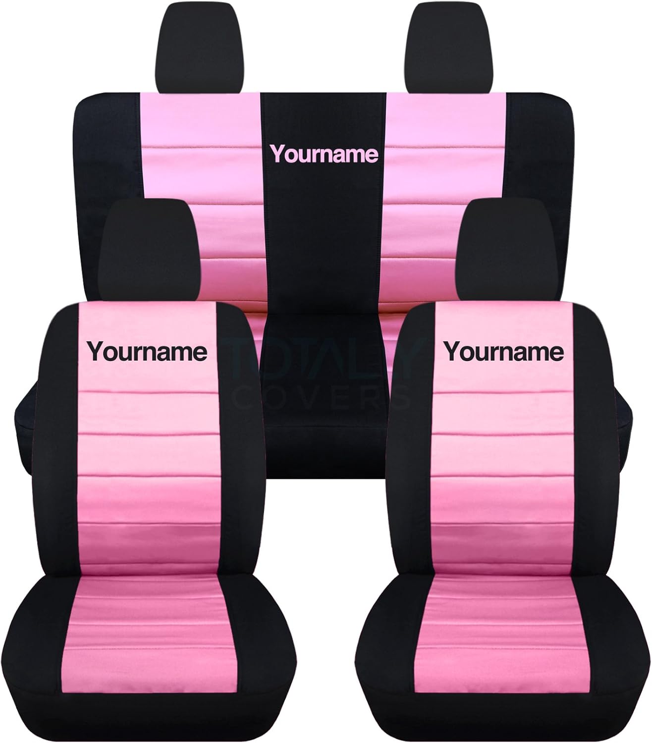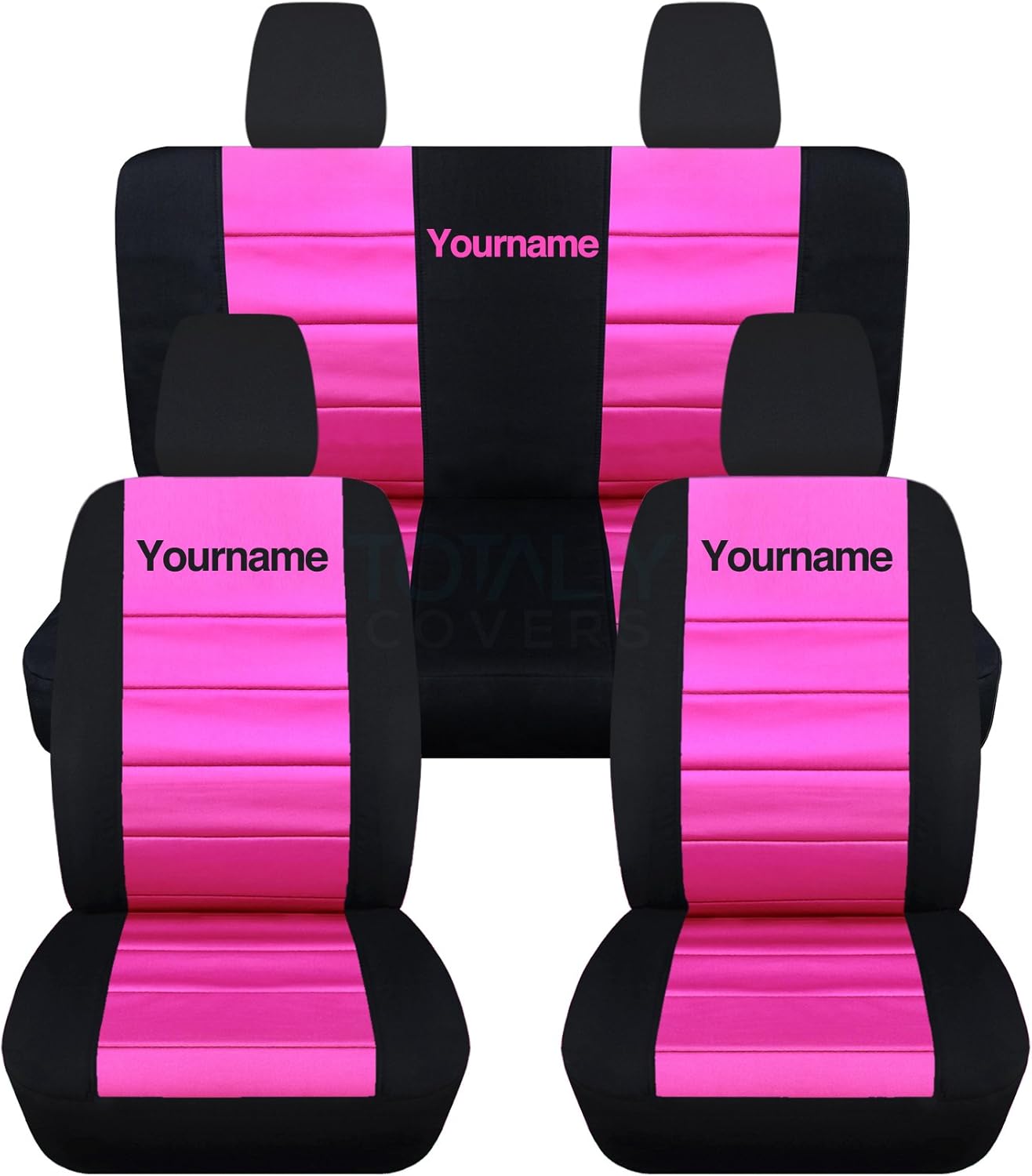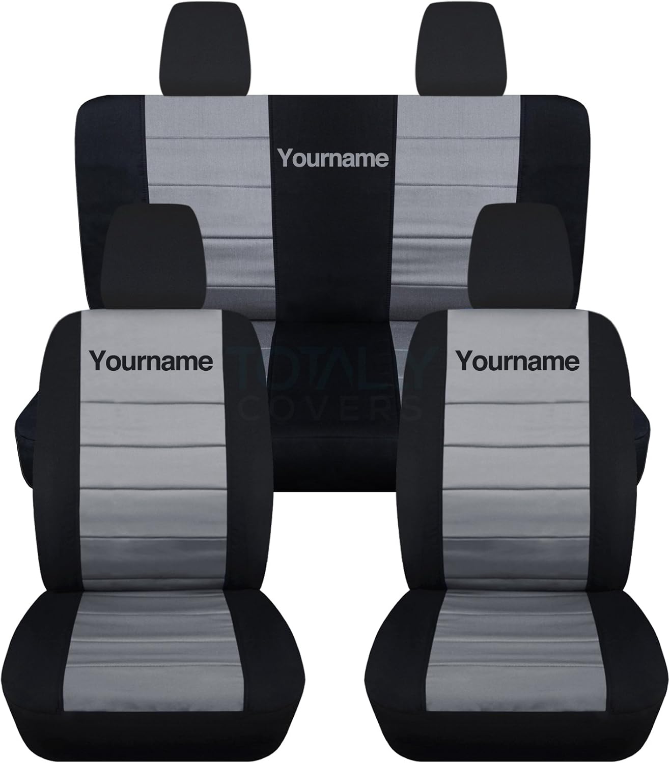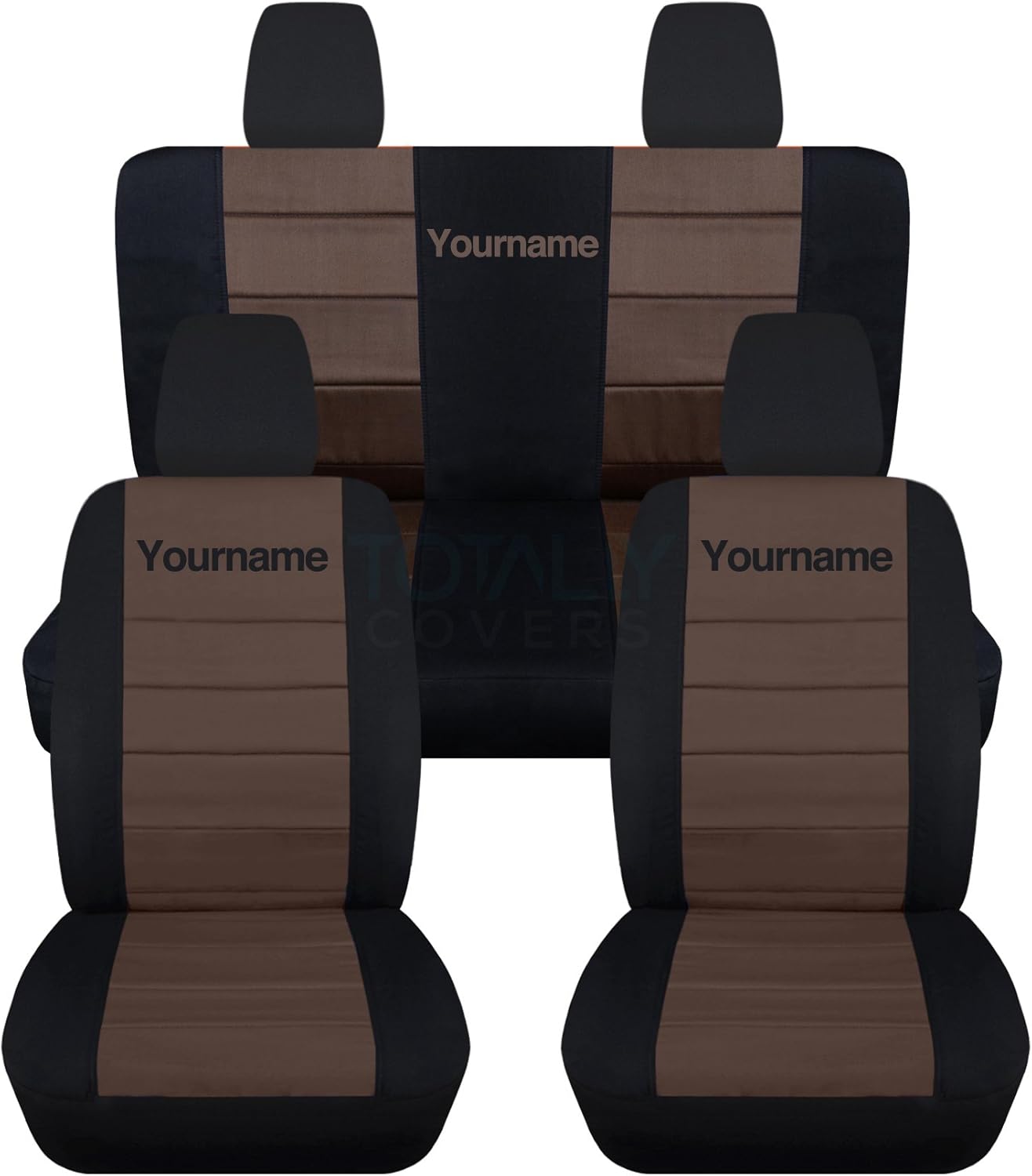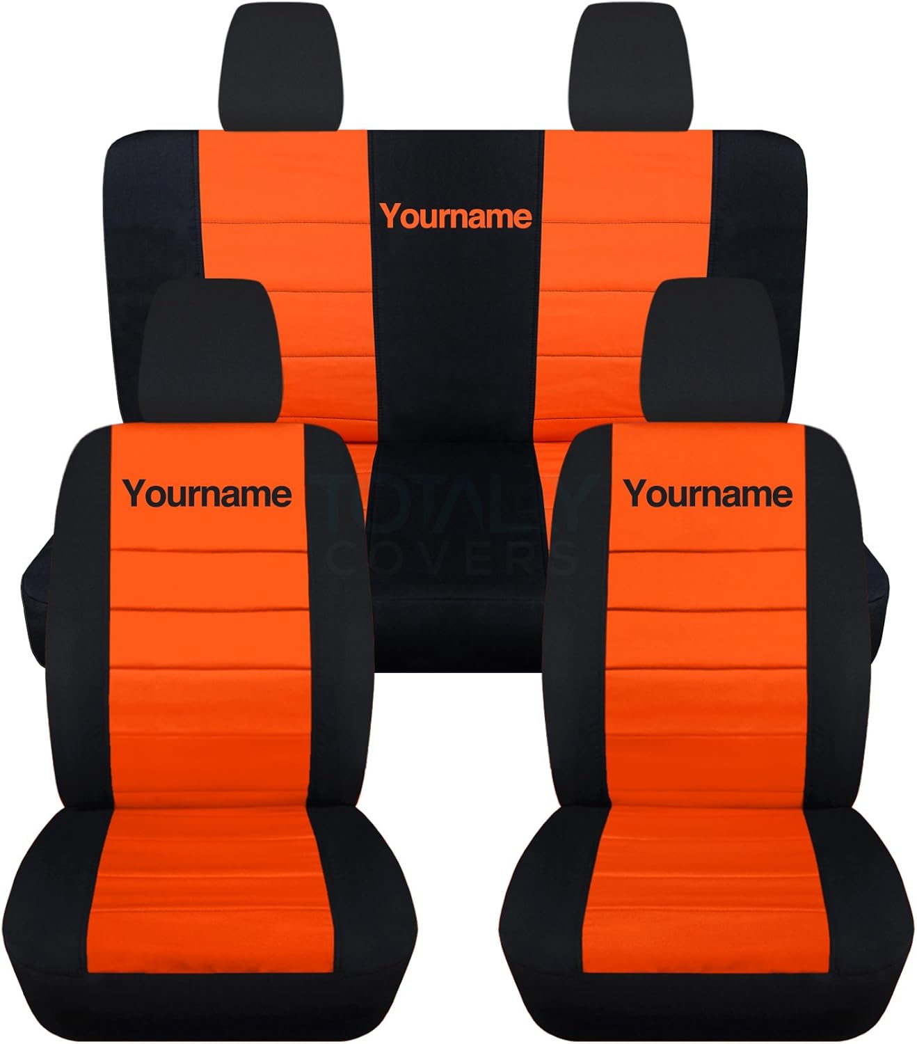 A full set of front and rear, black and hunter green seat covers for a 2010 to 2012 Jeep Liberty and Dodge Nitro, with your name or text on them. Be sure to visit our storefront ("Totally Covers") where you can find the largest selection of seat covers, to satisfy even the most demanding of tastes. If you can't find what you are looking for, please contact us ("Totally Covers") We can make seat covers for ANY car, truck, van, RV or SUV in a variety of 145 colors and prints, and even add your name/text and logo/design on them!