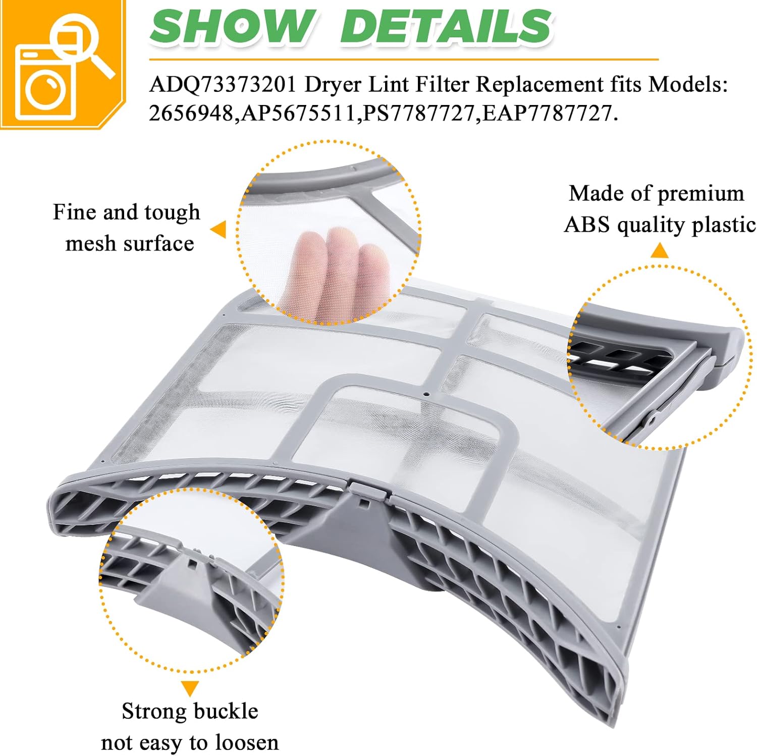 | Material | Dryer lint screen ADQ73373201 is made of premium ABS quality plastic and high quality mesh surface, the mesh surface is very fine and tough, Increase the durability, exact fit, not easy to break |