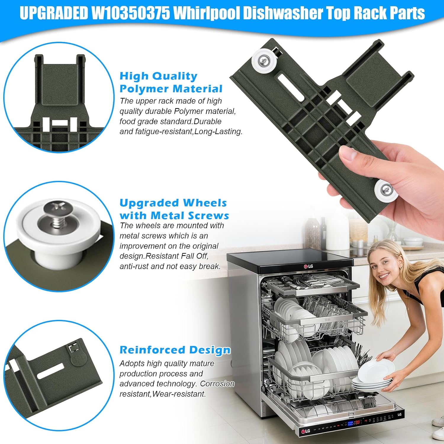 | Additional Features | W10350375 for whirlpool dishwasher top rack parts are made of new polymer material, stronger than other materials, durable and fatigue-resistant, especially the interface of these wheels is reinforced with metal screws to prevent the pressure from falling off drop. |