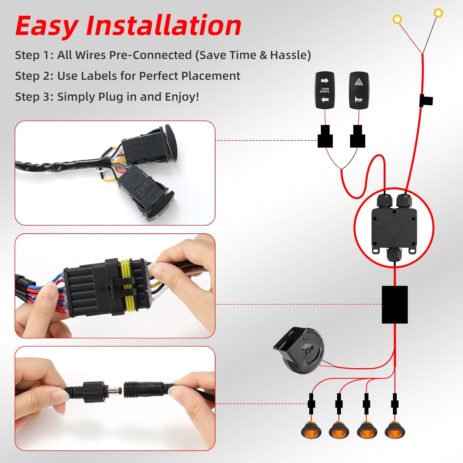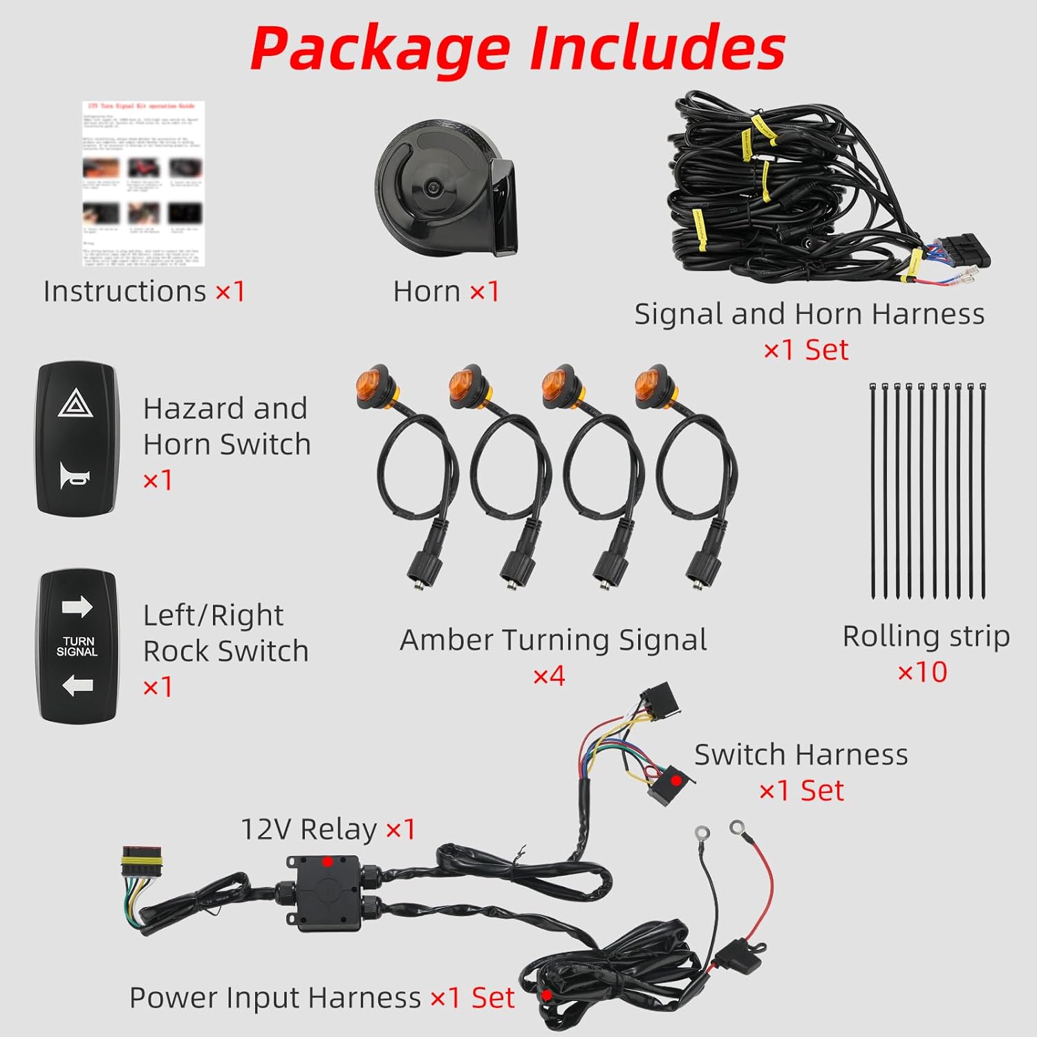 | Included Components | Amber Turning Signal Lights x4 110DB Horn x1 Left/Right Rock Switch x1 / Hazard and Horn Switch x1 Harness x1 set / Relay x1 / Cable Ties x1set Installation Guide x1 |