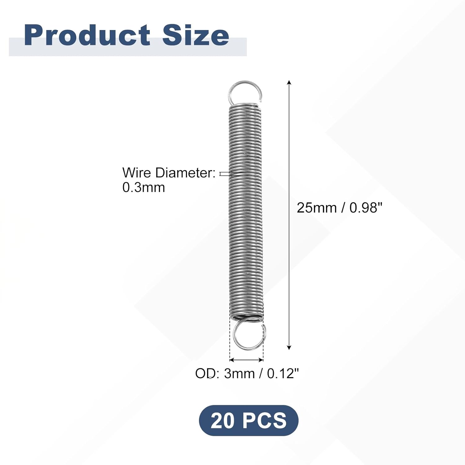 • Package Content: You will receive 20Pcs Stainless Steel Extension Springs, the diameter of spring wire is 0.3mm, the outer diameter of spring is 3mm / 0.12 inch, the spring length is 25mm / 0.98 inch