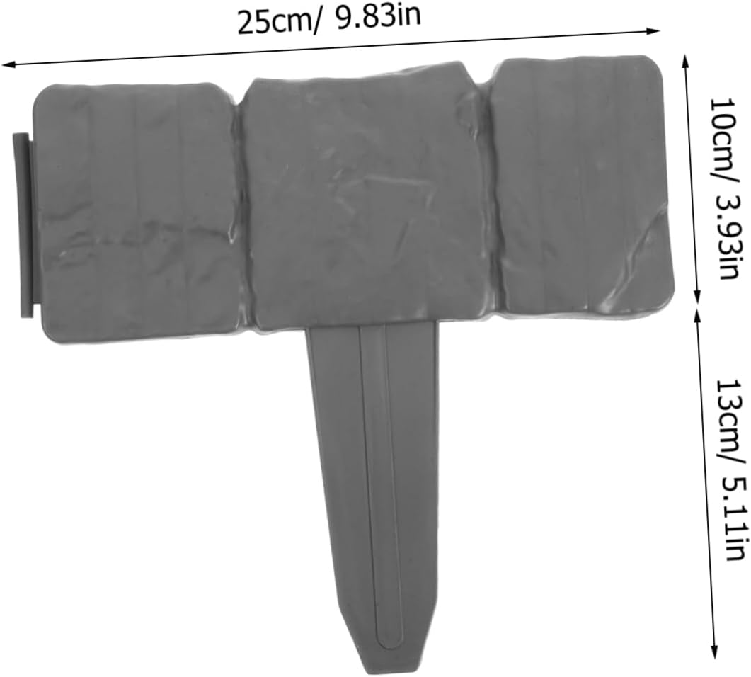 Package Include 20 x garden fence edging Characteristics -Size:25.00X13.00X10.00cm/9.82X5.11X3.93in faux stone garden edging border -Stylish and simple design: the picket fence design is both stylish and simple, making it suitable for various garden settings and enhancing the overall look decorative fences. -Color:Grey edging stones -Flexible and sturdy: made from flexible plastic, this garden edging is resistant to breaking and can withstand different weather conditions garden fence border. -Material:PVC dog fencing -Natural stone appearance: the plastic material of the garden fence mimics the look of real stone, creating a natural and harmonious appearance in your garden decorative fence. -Effortless installation: the fence is easy to install and can be freely combined, allowing you to DIY the shape and size to fit your garden's layout landscape edging. -Wide range of applications: ideal for vegetable gardens, pathways, farms, and villa gardens, this product offers versatility for your outdoor spaces flower bed edgingGoods Descriptionimitation stone garden fence Each set comes with 20 pieces, making it suitable for various garden sizes and shapes.faux stone landscape edging This decorative garden fence is ideal for outlining flower beds, creating a clear separation between different areas of your yard.decorative fencing The faux stone plastic fence is a practical and attractive for garden edging.no dig border edging The plastic grass border is easy to install, with no digging required, and the interlocking design allows for flexible configurations