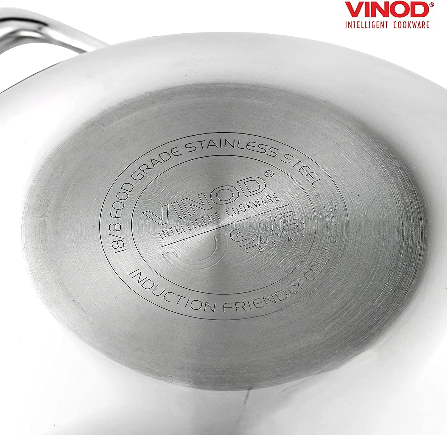 VINOD EXTRA DEEP KADAI WITH STAINLESS STEEL LID - PLATINUM RANGE The Kadai is a staple utensil in Indian kitchens for centuries. Mainly used to cook vegetables, this Kadai brings the best to your kitchen! The Integrated layer of aluminium right through, even at the bottom helps in faster cooking and in efficient heat retention that helps to keep food warm for a long time. Its Triple layer with the superior Food Grade 18/8 stainless and SS 430 magnetic stainless steel that supports Induction cooking. Cookware range for Industrial and Home Chefs. Platinum Extra Deep Kadai is specially designed for reliable and hygienic everyday cooking in home and industrial kitchens, hygienic cooking: Using top grade material the platinum Extra Deep Kadai guarantees hygienic cooking, the surface does not char or reacts with food items and gives you clean and safely cooked food. Induction safe: The Vinod triple – layered platinum Extra Deep Kadai is safe to use inductions cook stove and can also be used on a halogen, electric stove tops and is dishwasher safe. Durability: The inner surface of the Platinum Extra Deep Kadai is covered with 18/8 stainless steel which is the most superior quality of stainless steel in the food grade category that imparts durability to the vessel making it last for generations. Layer 1-food grade 18/8 stainless steel used in the inner surface for healthy cooking, 18/8 stainless steel is the most superior stainless steel with the longest life. Layer 2-encapsulated layer of aluminium right throughout the cookware including the bottom and the body, this helps in even heat distribution, less cooking time, minimum burning of food Layer 3-SS 430 magnetic stainless steel used as the 3rd layer, making cookware induction friendly, the cookware can also be used for conventional cooking Ideal for cooking on all hobs including induction hobs Dishwasher safe, Color: Silver, Material: Stainless Steel