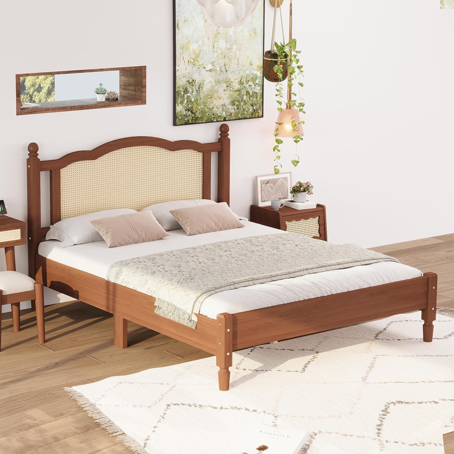 Transform your bedroom into a serene retreat with our Wooden vintage bed frame featuring a stunning Rattan Headboard. This exquisite piece effortlessly combines the rustic charm of natural rattan with sleek, modern design elements. Perfect for anyone looking to elevate their bedroom's aesthetic, our headboard exudes a minimalist yet sophisticated style. Crafted to enhance the warmth of your space, it adds a touch of nature while remaining firmly rooted in contemporary decor. Whether you aspire to achieve a cozy coastal vibe, embrace free-spirited bohemian flair, or pursue a clean, modern look, this rattan headboard seamlessly complements any design vision. Elevate your bedroom's charm and create a relaxing atmosphere with this unique blend of elegance and simplicity. Upgrade your sleep space today and enjoy the perfect mix of style and comfort—your dream retreat awaits. Features: Product Type: vintage bed frame Color: Walnut/Black Product material: MDF, Plywood, Rattan, Pine Wood Size: Full/Queen Number of Slats: 10 Weight Capacity: 600LBS Recommended Mattress Thickness: 8"-10" Assembly Required: Yes Country of Origin: Vietnam