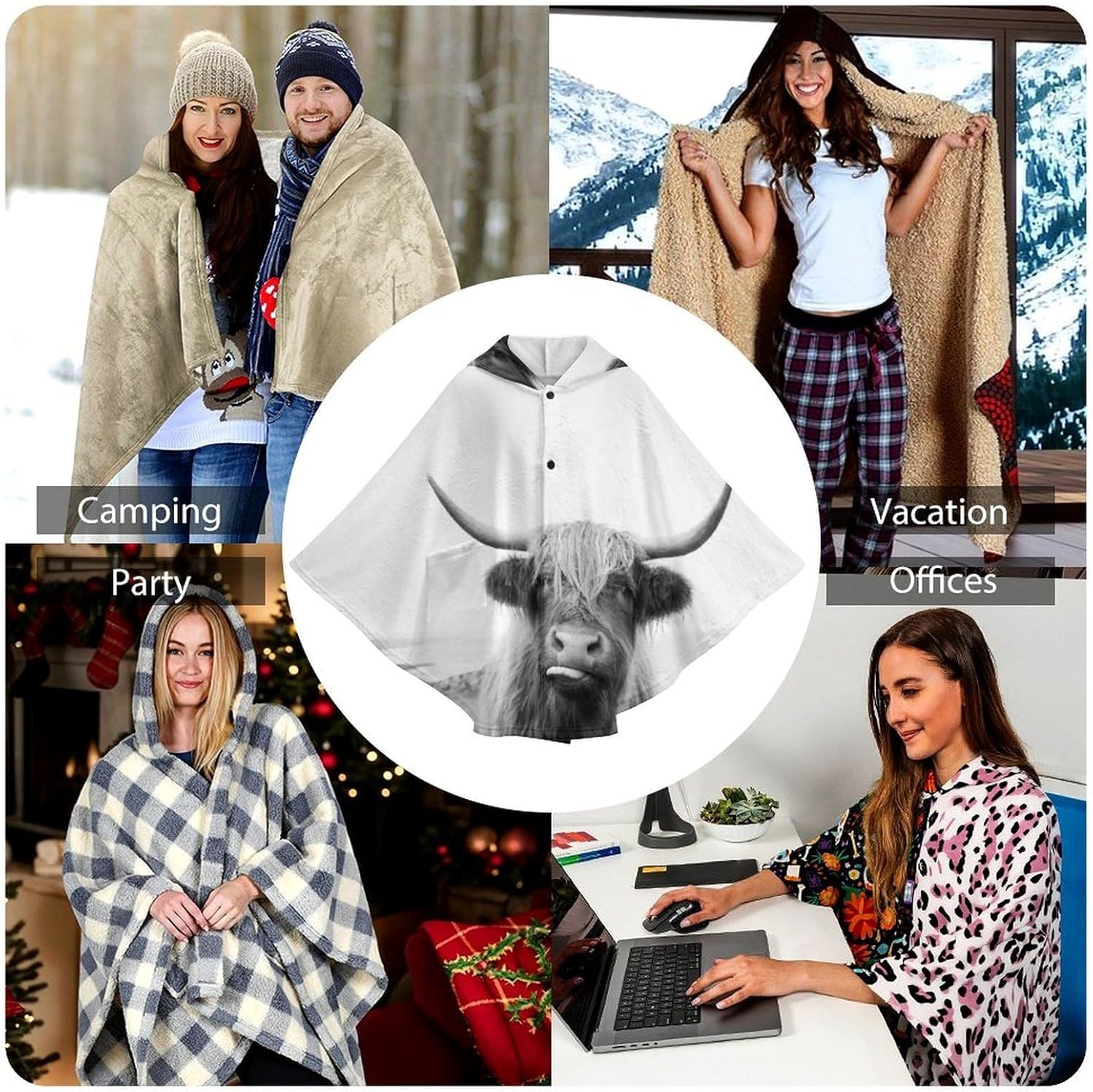 The wearable blanket is made of soft and comfortable flannel fabric, which makes you feel warm in spring, autumn and winter. It has a cape-like shape, a button closure for easy wearing and taking off, and two pockets.