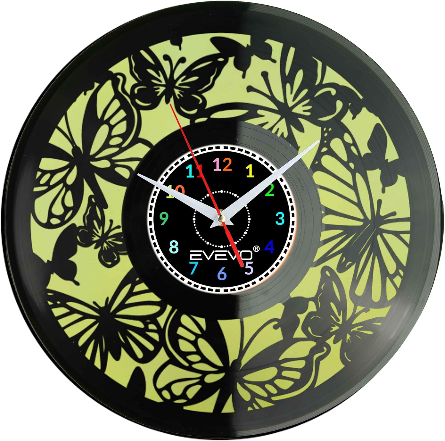 Butterflies Wall Clock - Butterflies, Entomology, Kites - Vinyl record with fluorescent background - Cute and original wall clock made from a recycled vinyl record, inspired by the beauty of nature and the softness of butterflies. Perfect for nature lovers, entomology lovers, collectors and people who appreciate unique home decorations. Fluorescent Backdrop - The dial and hands glow in the dark after previously illuminated, creating a magical and light effect at night. Ideal for children's rooms, living rooms, bedrooms, and nature studios. COLORS AND PERSONALISATION - Available in a variety of color variations, with a choice of pointer style and additional stickers to match your personal décor. ️ HIGH QUALITY & PRESSION - 30 cm diameter provides excellent readability, while quiet quartz movement guarantees smooth and reliable performance, perfect for everyday use. Perfect Gift and Keepsake - The butterfly clock is a great gift idea for nature lovers, children, collectors and people who appreciate subtle natural design. Suitable for birthdays, holidays, anniversaries or as an original gift. Stylish and eco-friendly - Made of recycled vinyl record, the clock combines unique design with environmental concern and adds lightness and natural charm to the interior.