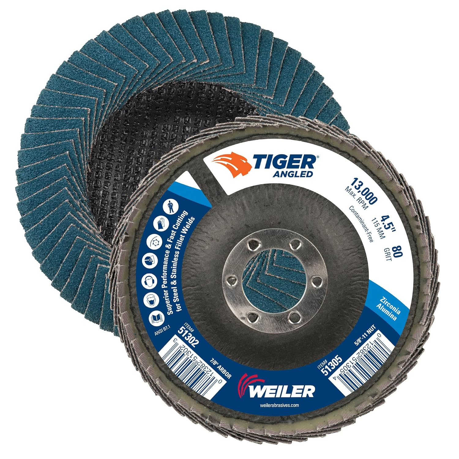 | Included Components | 4-1/2" Tiger Angled Flap Disc, Cloth Backing, Zirconia Alumina 80Z Grit |