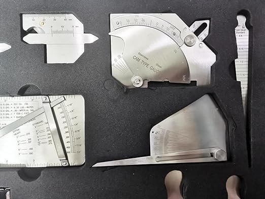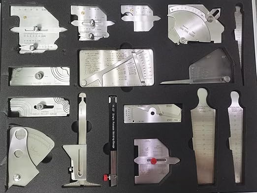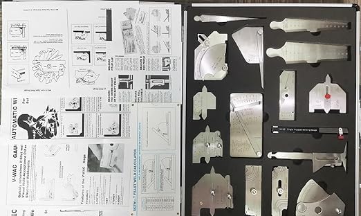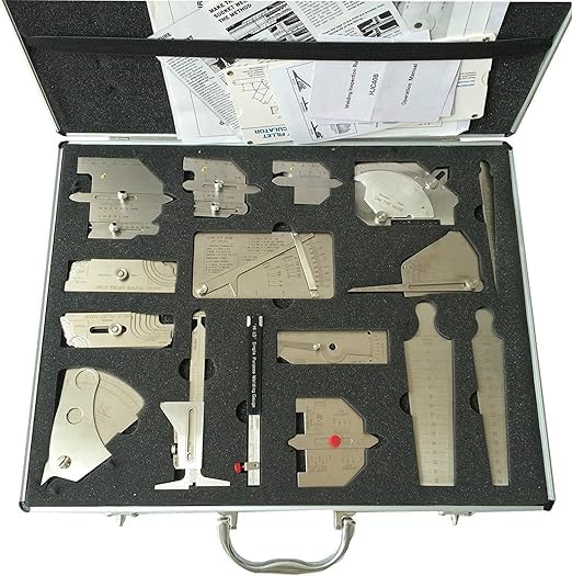 Components: 1pcs 1-15mm Taper Test Ulnar 1pcs 15-30mm Taper Test Ulnar 1pcs 30-45mm Taper Test Ulnar 1pcs MG-8 Cam Welder Inspection 1pcs HJC40A Seam Gap Gage 1pcs HJC40B Seam Gap Gage 1pcs HJC60 Seam Gap Ruler 1pcs Skew-T Fillet Welding Caculator 1pcs Pipe Pit Gage 1pcs MG-11 7 Piece Fillet Weld Inspection MM/INCH 1pcs MG-11 7 Piece Fillet Weld Inspection MM 1pcs Sector Weld Gage 1pcs HI-LO Weld Gage 1pcs Internal Economy Single Purpose HI-LO Welding Gage 1pcs Automatic Weld Gauge 1pcs V-wac Welding Gauge